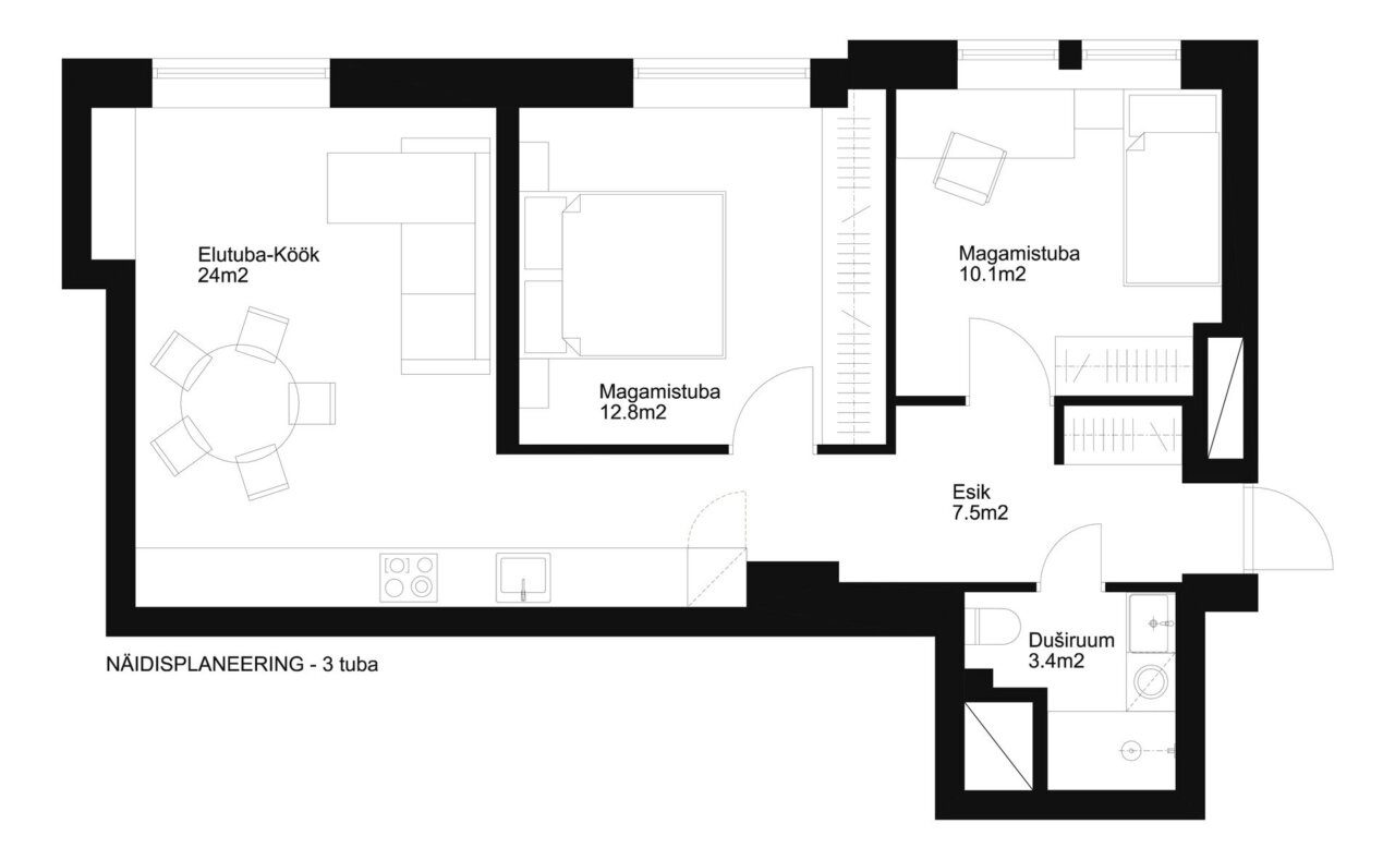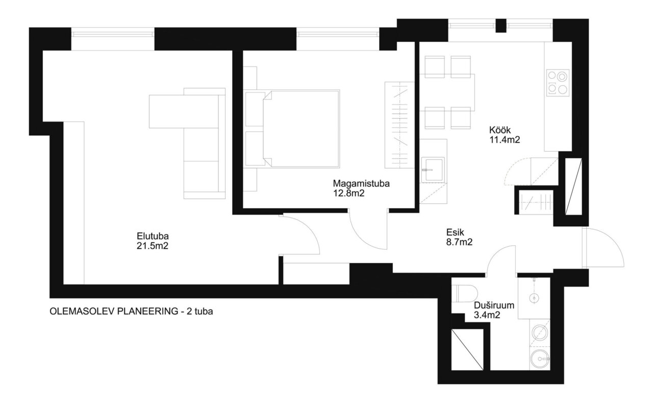 Korteri planeering on hetkeseisuga lahendatud kahetoalisena ning eraldi asuva avatud köögiga, kuhu pääseb esikust. Perspektiivis on köök võimalik liita elutoaga ning praeguse köögiruumi asemele on võimalik planeerida teine magamistuba. Vaata näidisplaneering.