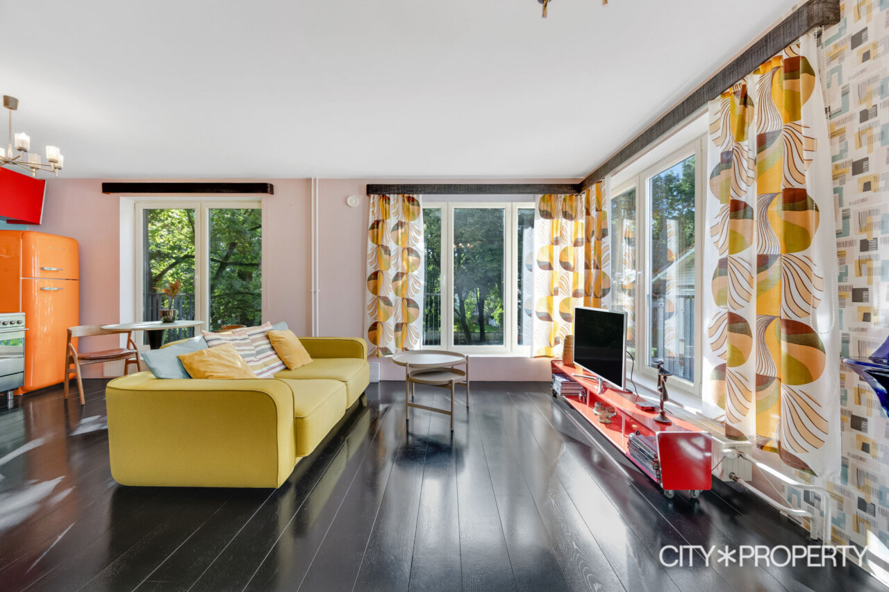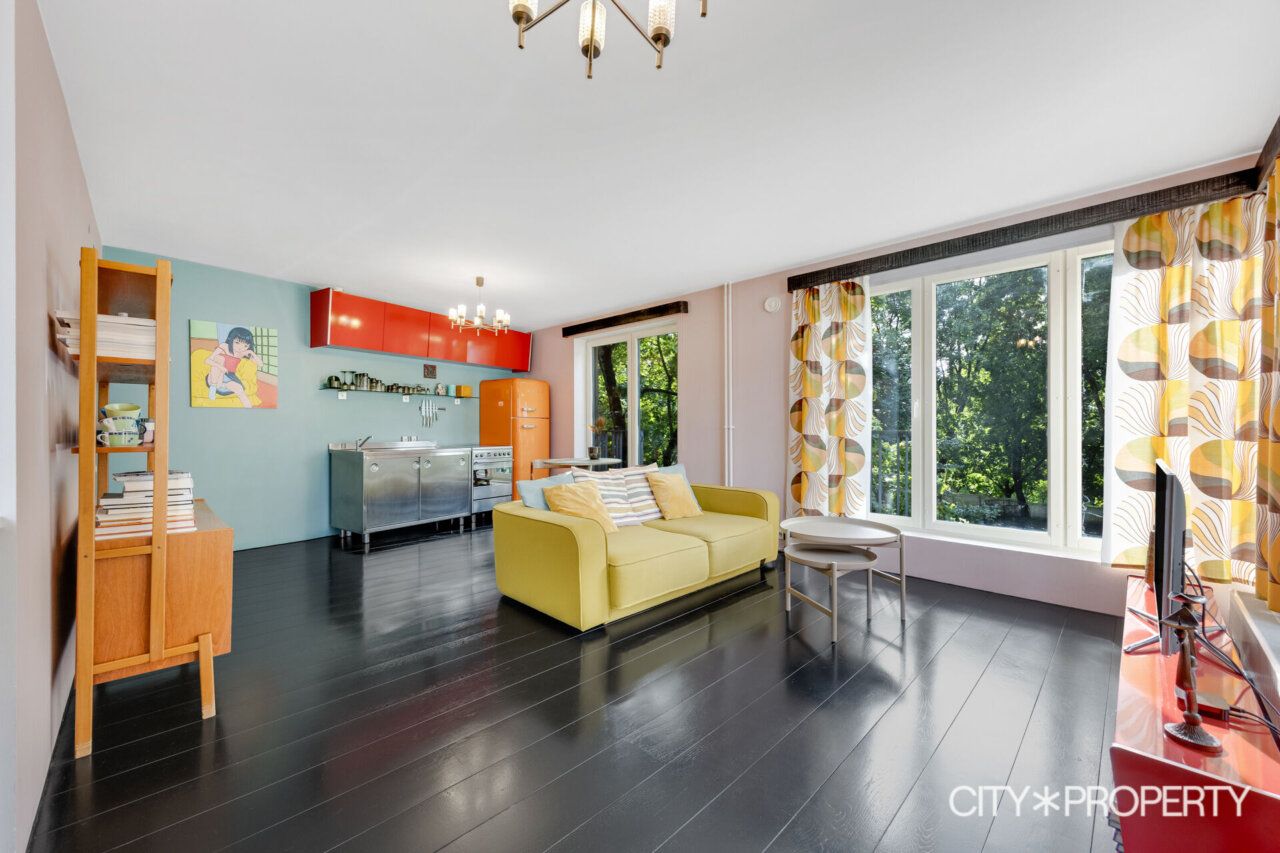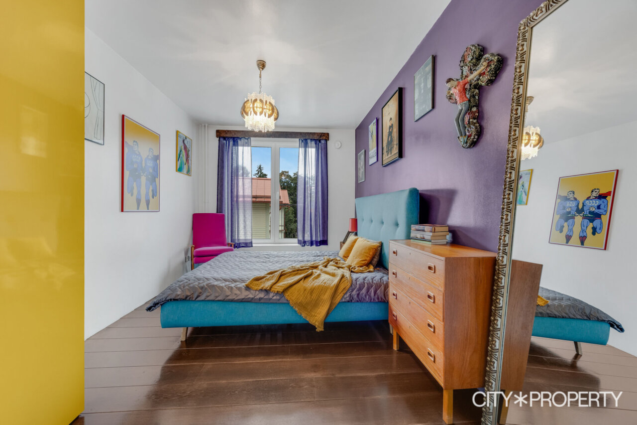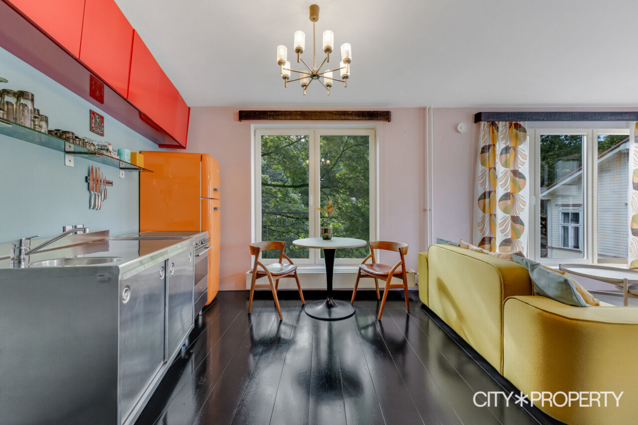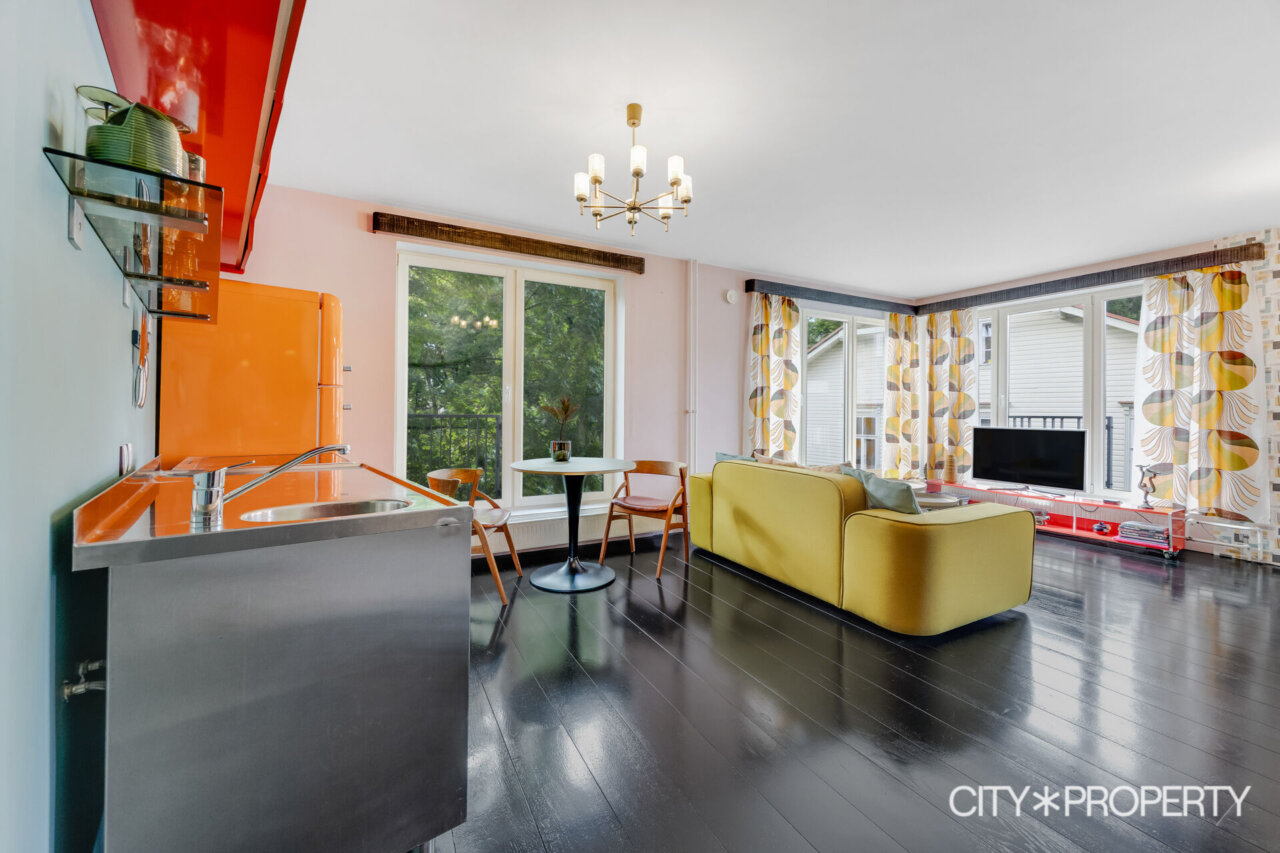 Siin kodus on värve ja karismat, põrandatel on musta värvi laudparkett, lagede materjaliks väljapuhastatud pinnaga lakitud betoon. Siseustena on kasutusel värvilisest klaasist lükandpaneelid. Mõlemas magamistoas on sisseehitatud garderoobikapid. Kirevust lisavad erksavärvilised mööbliesemed, geomeetrilise graafikaga kardinad elutoas ning retrošikid rippvalgustid ruumide laes.