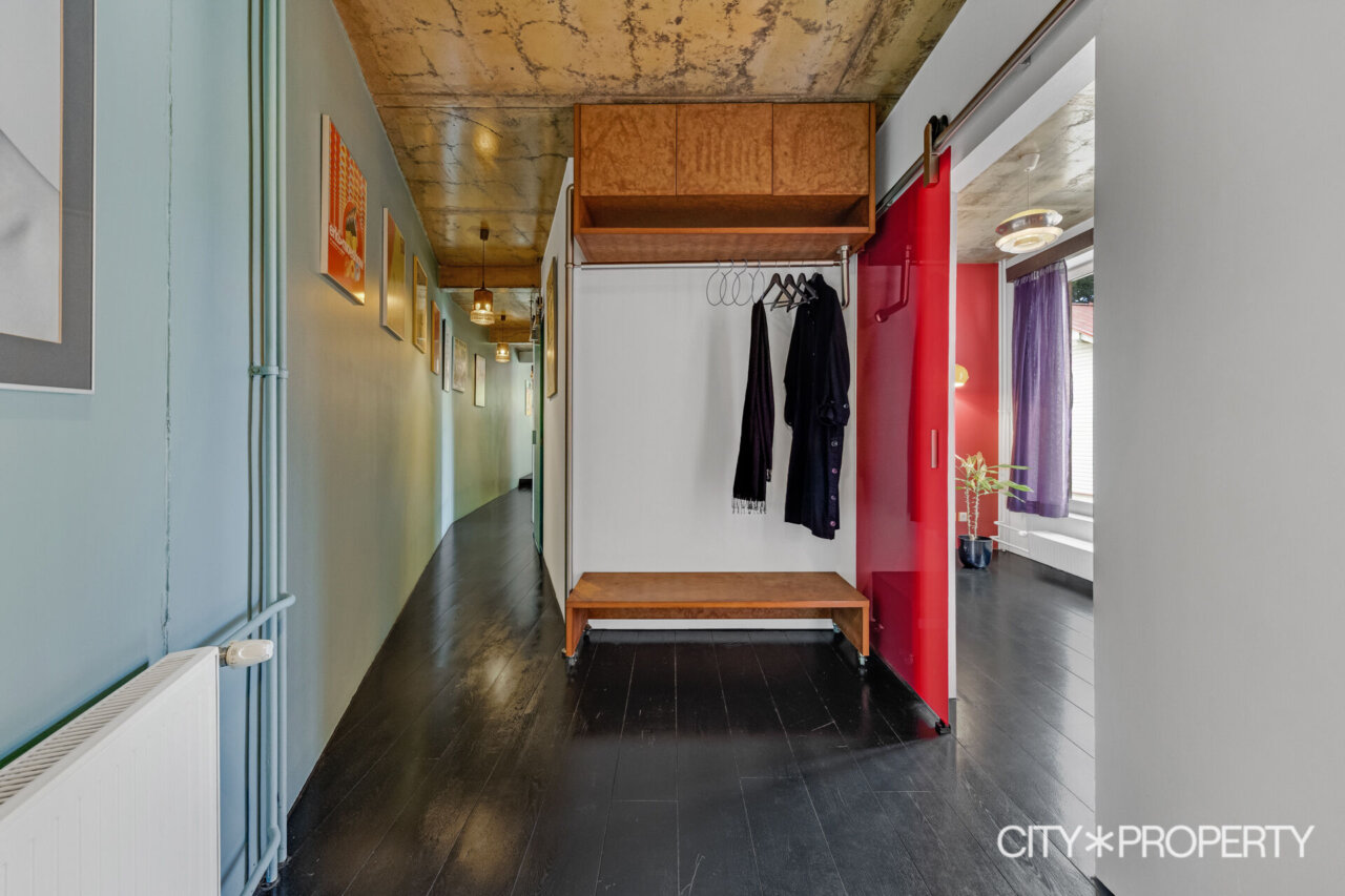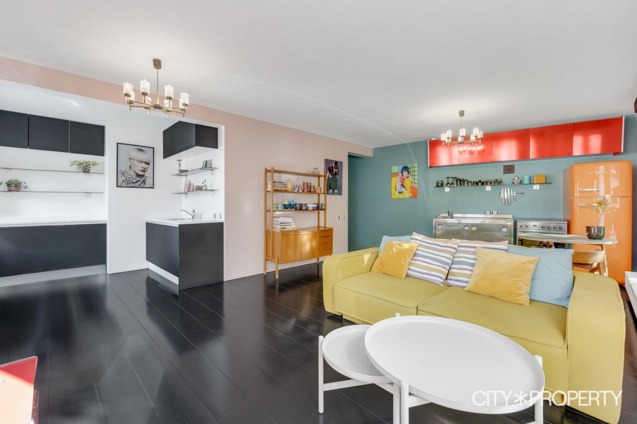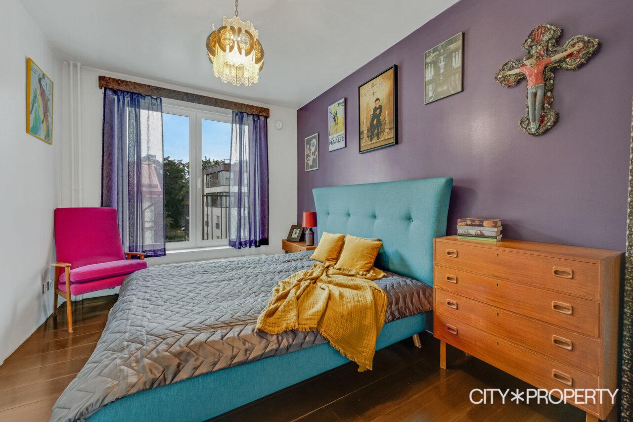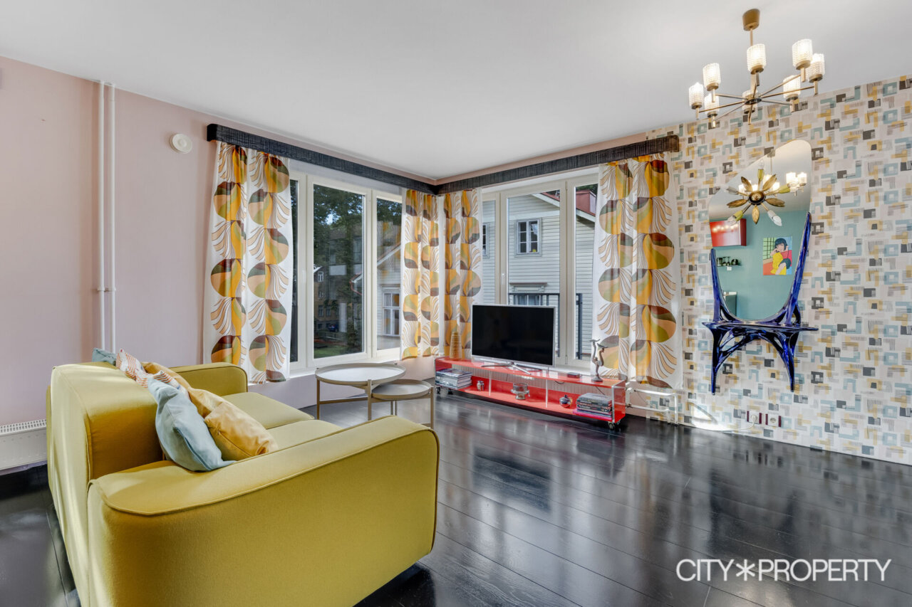Siin kodus on värve ja karismat, põrandatel on musta värvi laudparkett, lagede materjaliks väljapuhastatud pinnaga lakitud betoon. Siseustena on kasutusel värvilisest klaasist lükandpaneelid. Mõlemas magamistoas on sisseehitatud garderoobikapid. Kirevust lisavad erksavärvilised mööbliesemed, geomeetrilise graafikaga kardinad elutoas ning retrošikid rippvalgustid ruumide laes.