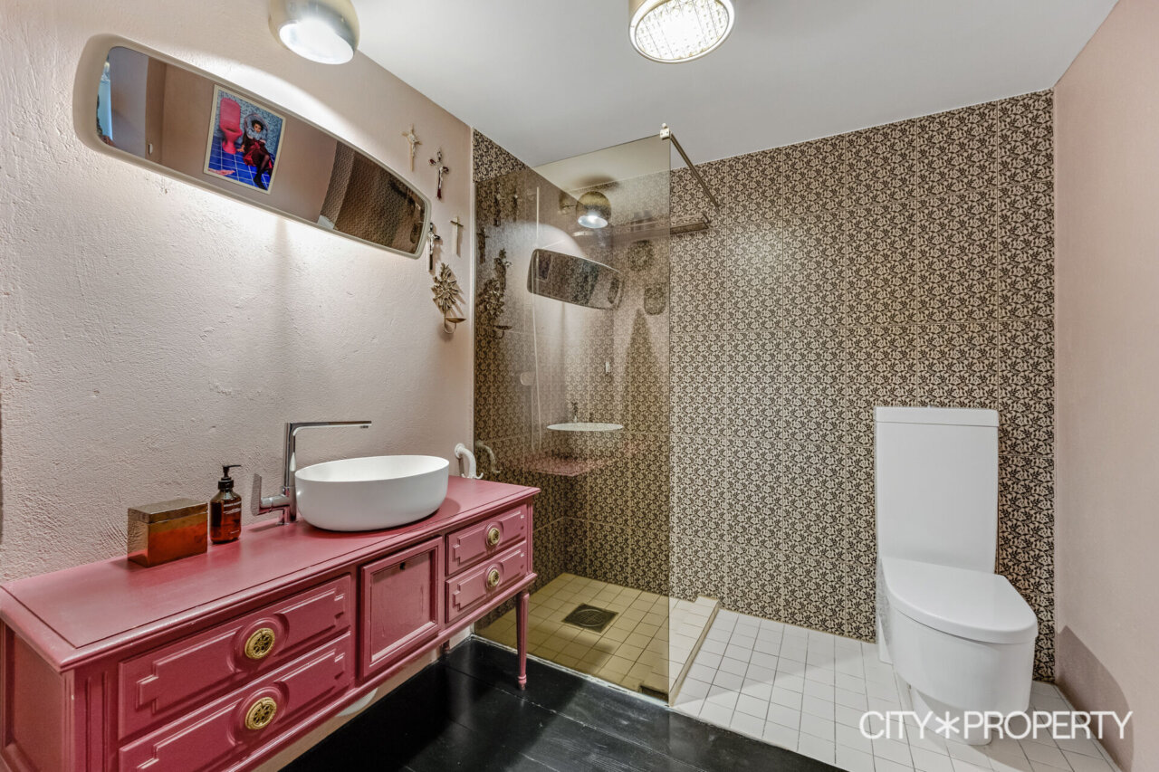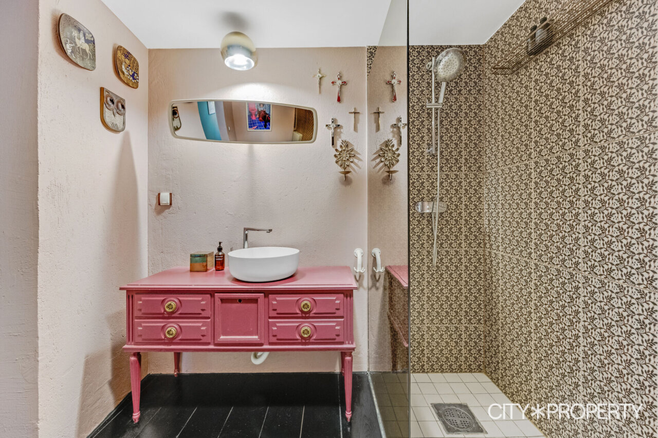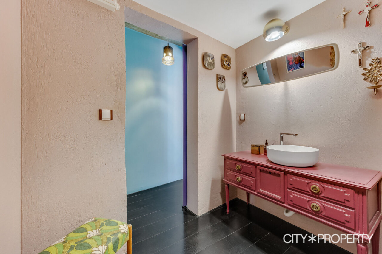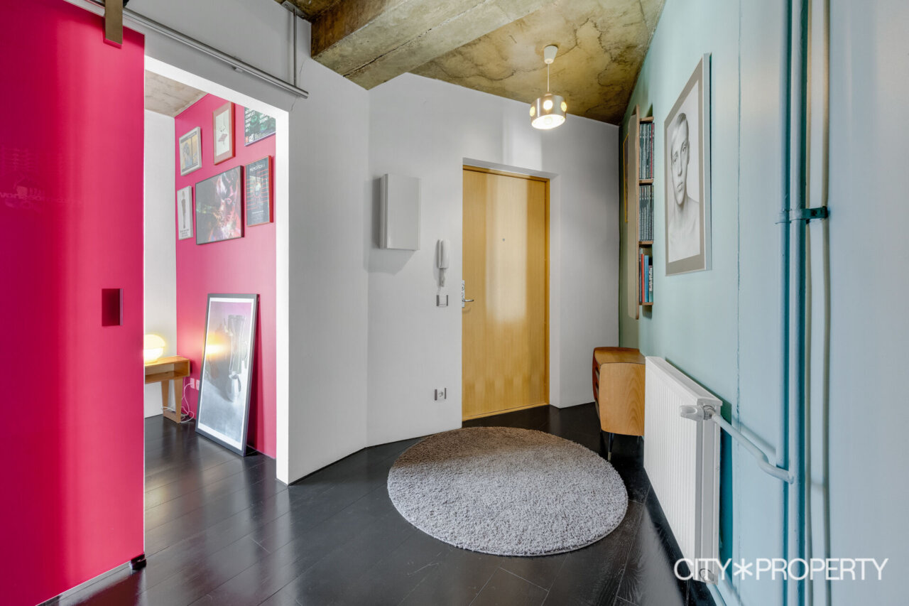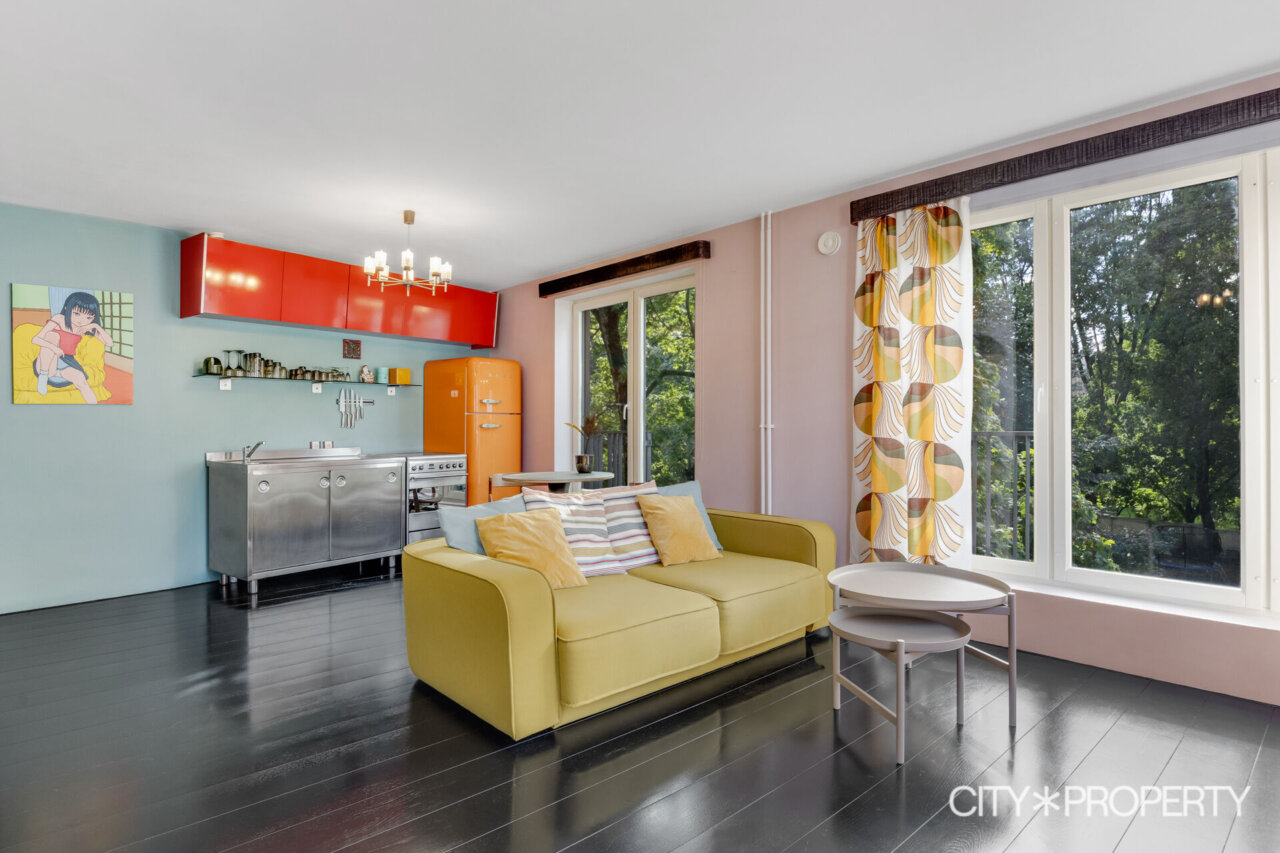 Siin kodus on värve ja karismat, põrandatel on musta värvi laudparkett, lagede materjaliks väljapuhastatud pinnaga lakitud betoon. Siseustena on kasutusel värvilisest klaasist lükandpaneelid. Mõlemas magamistoas on sisseehitatud garderoobikapid. Kirevust lisavad erksavärvilised mööbliesemed, geomeetrilise graafikaga kardinad elutoas ning retrošikid rippvalgustid ruumide laes.