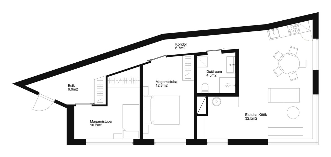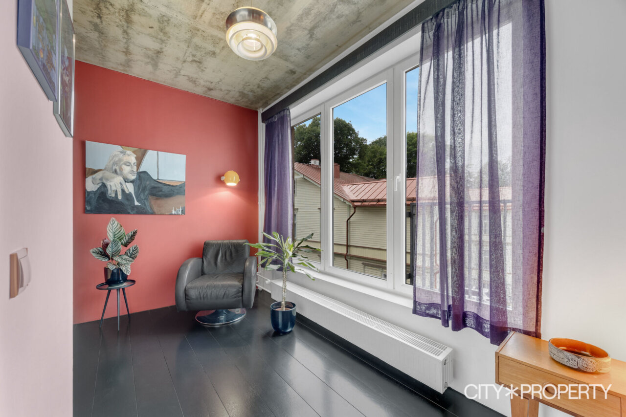 Rikkaliku ajalooga Tatari tänaval, põneva ja sihvaka vormiga kortermaja kolmandal korrusel asub isikupärase stiiliga kujundatud kodu, mille suured aknad avanevad päiksepoolse siseõue suunal. Pikliku planeeringuga korteri ühes otsas asub sissepääs koos garderoobiga ning teises otsas avar, läbi korruse ulatuv elutuba koos köögiga. Looklevate seintega pikast koridorist pääseb kahte magamistuppa ning duširuumi koos tualetiga.