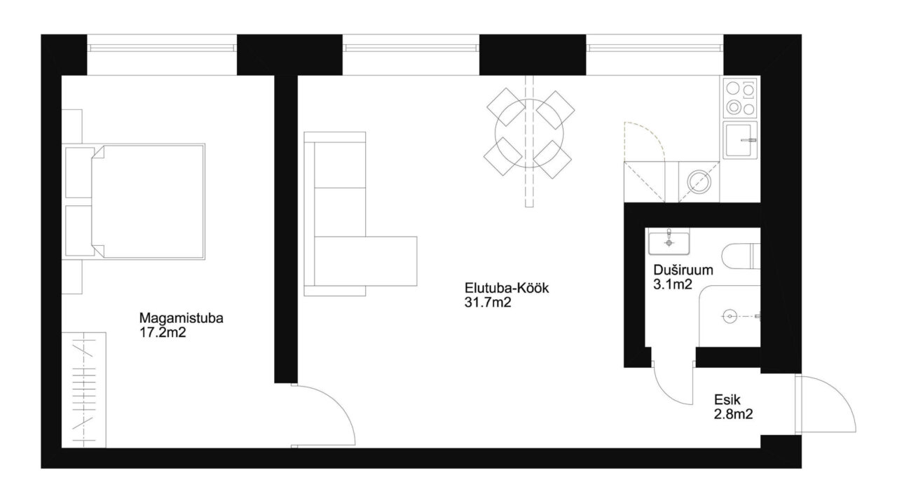 Korter koosneb ruumikast elutoast koos eraldiasuva köögiga ning magamistoast. Elutoa ja köögiala vahele on ehitatud ajutine kergsein, mille võib hõlpsalt eemaldada saavutades seeläbi ühtse ja tervikliku eluruumi.