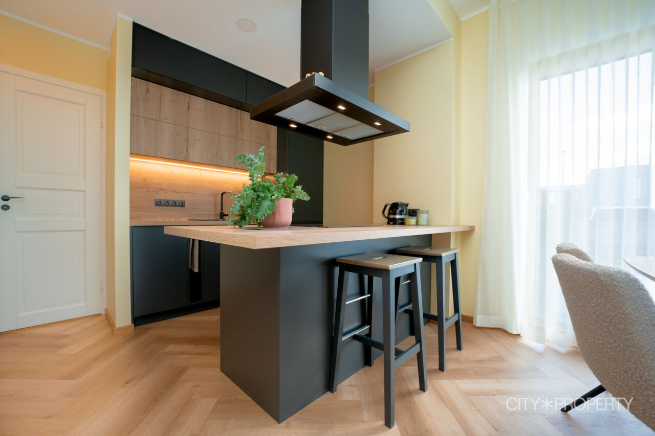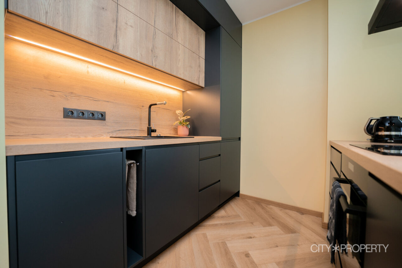 Avatud köök on sisustatud sisseehitatud köögimööbli ja integreeritud köögitehnikaga (külmik, induktsioonpliit, ahi, õhupuhasti). Köögimööbel koos tehnikaga kuulub müügihinna sisse.