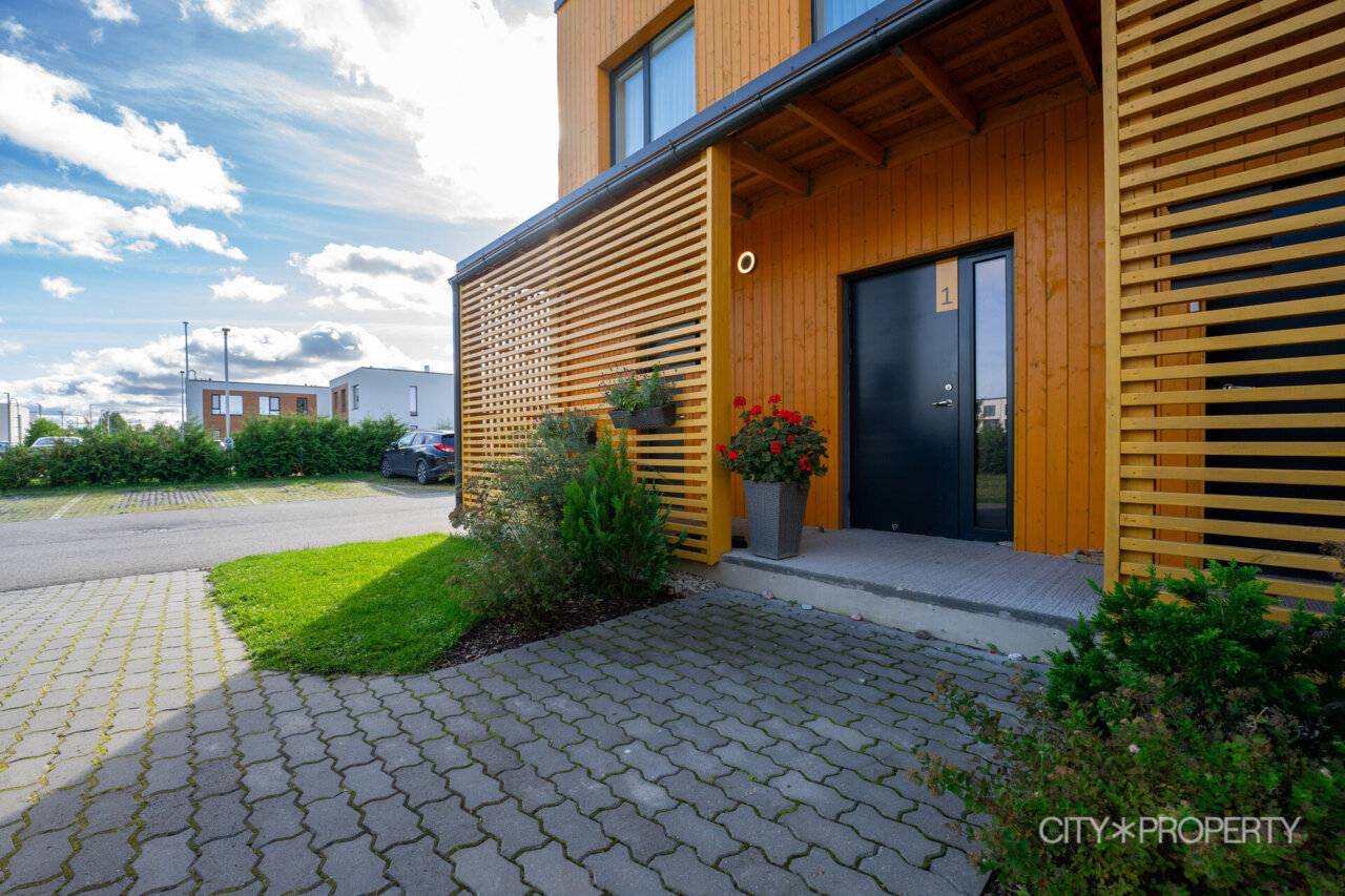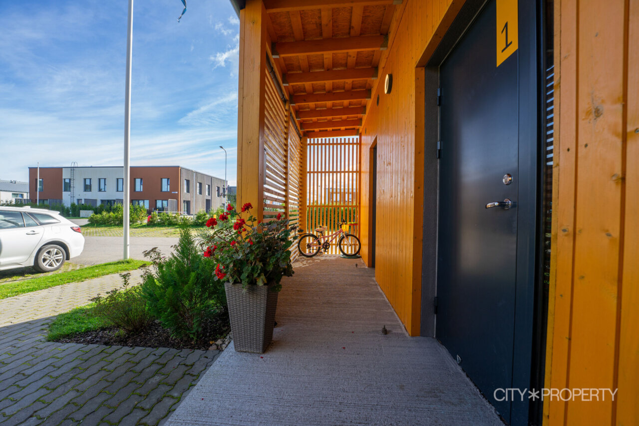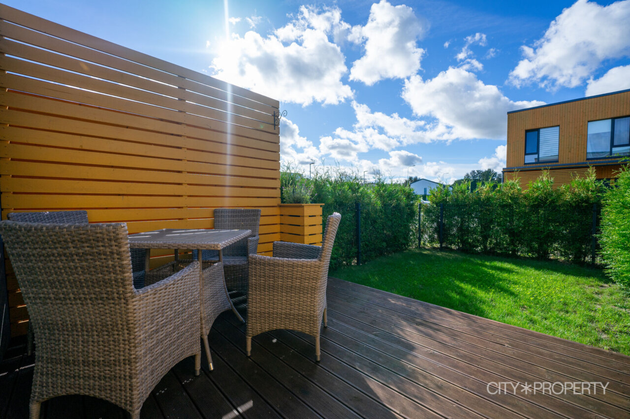 Elutoast avaneb väljapääs lõunapäikesega terrassile – ideaalne paik kohvi nautimiseks või suvisteks grilliõhtuteks. Terrassi ääristavad elupuud, mis pakuvad meeldivat privaatsust. Elutoa seina kaunistab Kristiina Deklau-Loogi maal. Piltidelt nähtav elutoa mööbel jääb korterisse kokkuleppel. Lisaks on esimesel korrusel WC ja panipaik.