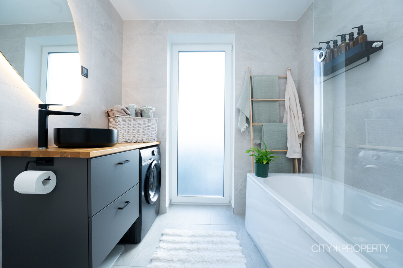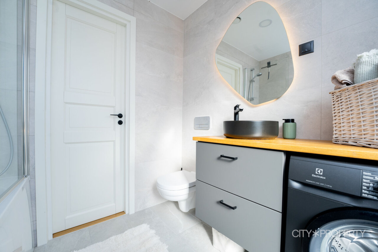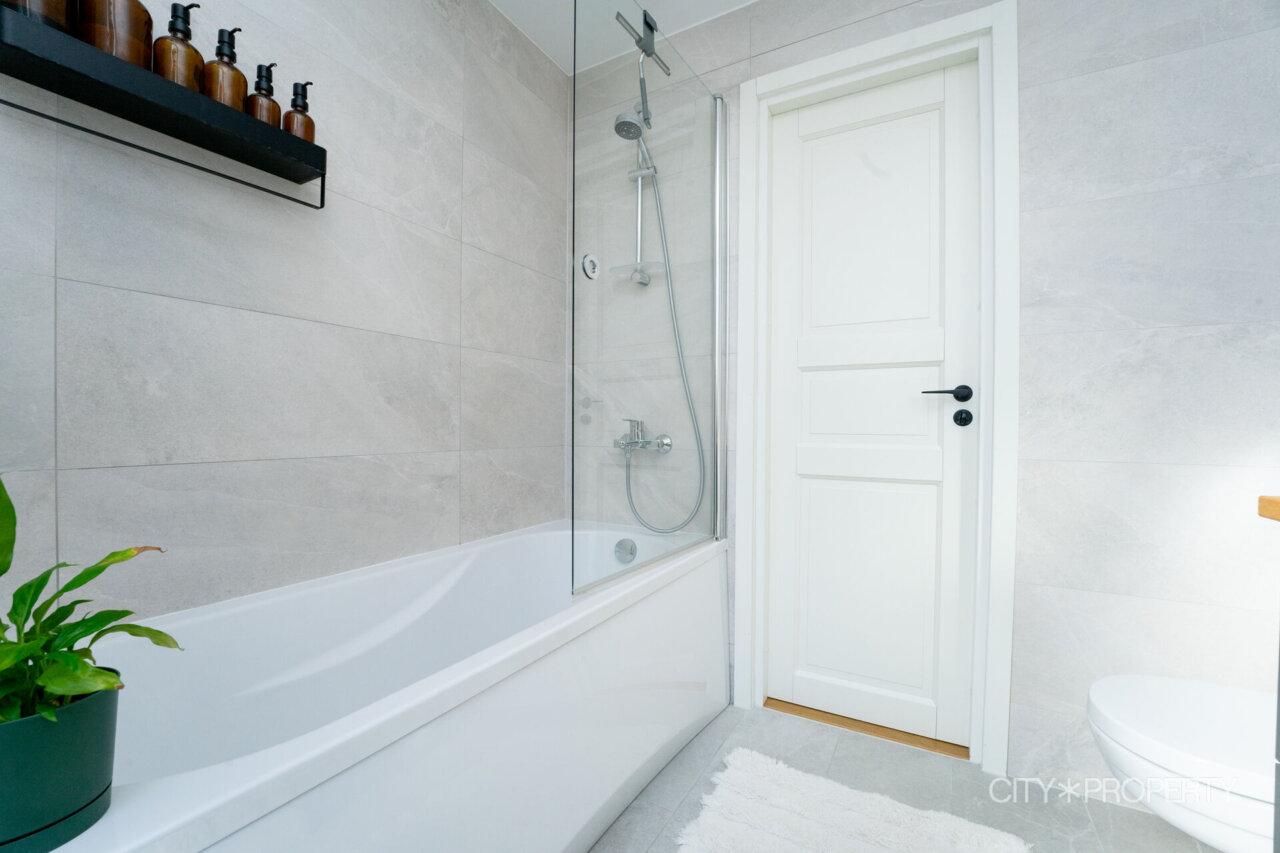 Vannituba/WC on heledates toonides. Olemas on dušš, vann klaasseinaga ning pesumasin. Kõik vannitoas olev kuulub müügihinna sisse.