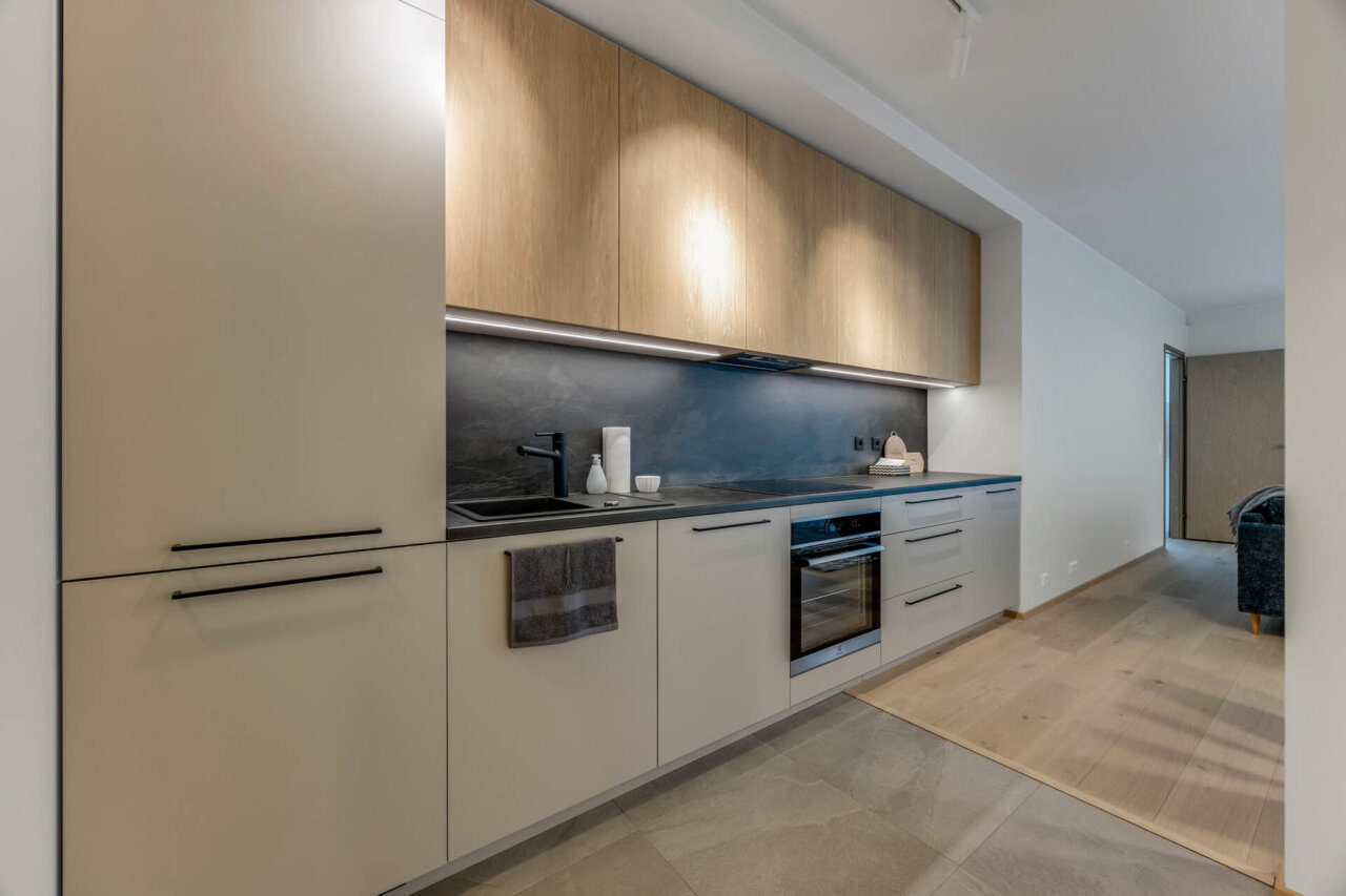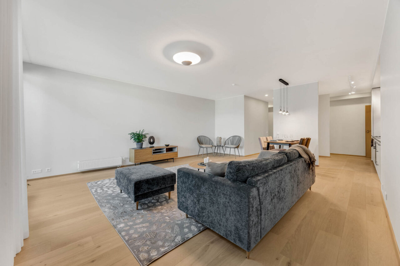 Korteri koosseisu kuuluvad esik ( 10.62m²), elutuba ( 31.55m²), köök ( 8.38m²), magamistuba ( 13.32m²), vannituba ( 7.8m²), saun ( 2.5m²), garderoob ( 3.34m²) ja suur rõdu ( 21.04m²). Tänu kõrgetele lagedele tundub korter veelgi ruumikam ja loovad rohkem avatud õhustiku.
