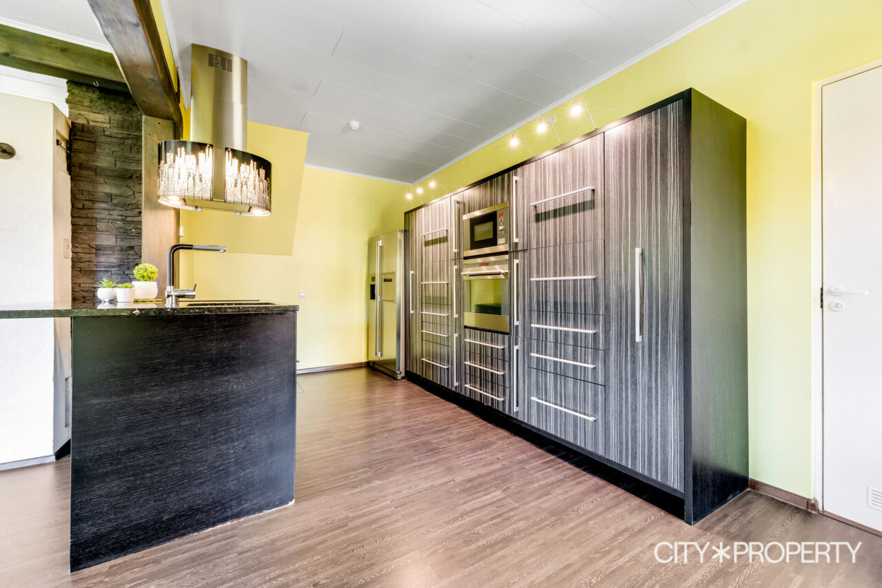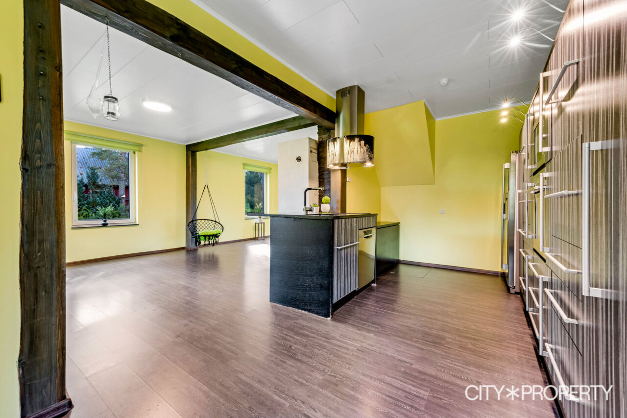 Eraldi asetsev kööginurk on sisustatud köögimööbli ja tehnikaga (elektripliit, elektriahi, õhupuhasti, nõudepesumasin, mikrolaineahi). Elutuba ja kööki eraldab kraanikausi ja töötasapinnaga köögisaar. Avaras elutoas on piisavalt ruumi, et tekitada sinna söögitoa osa, ning paigutada suur söögilaud koos toolidega, pere ühisteks söömaaegadeks.