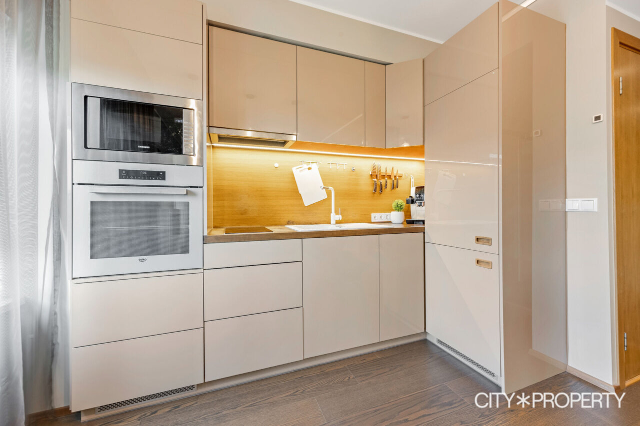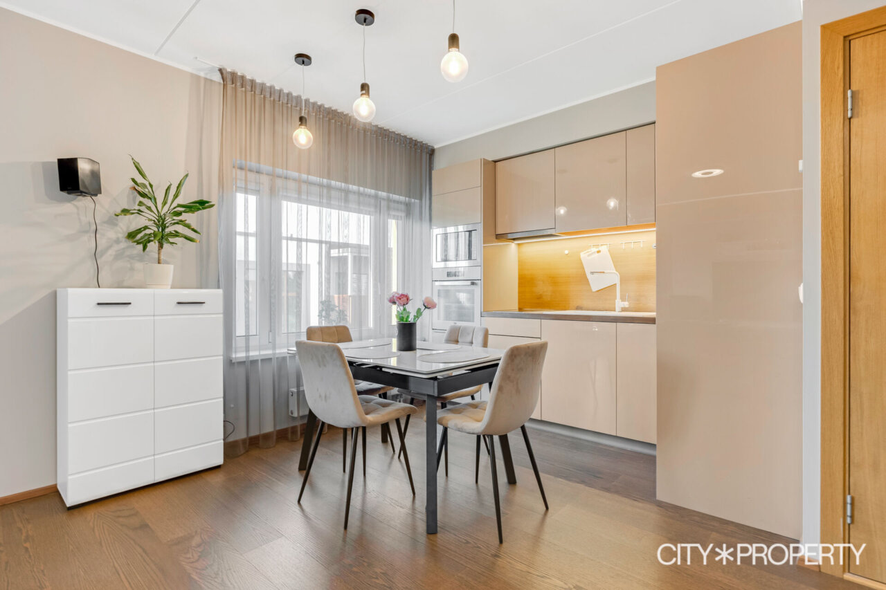 Kööginurk on sisustatud köögimööbli ja tehnikaga (elektripliit, elektriahi, õhupuhasti, külmik). Lisaks on olemas suur söögilaud koos toolidega, mis eraldab elutuba ja kööki.