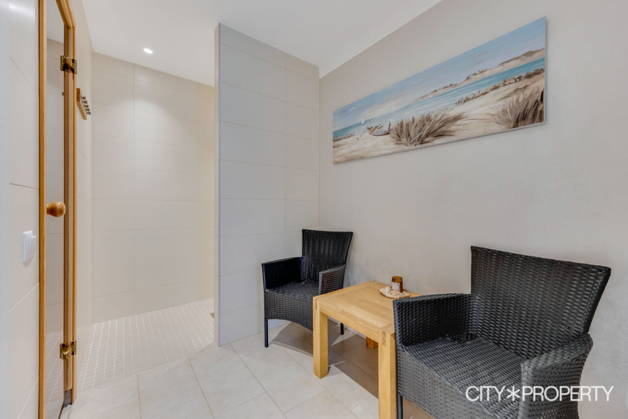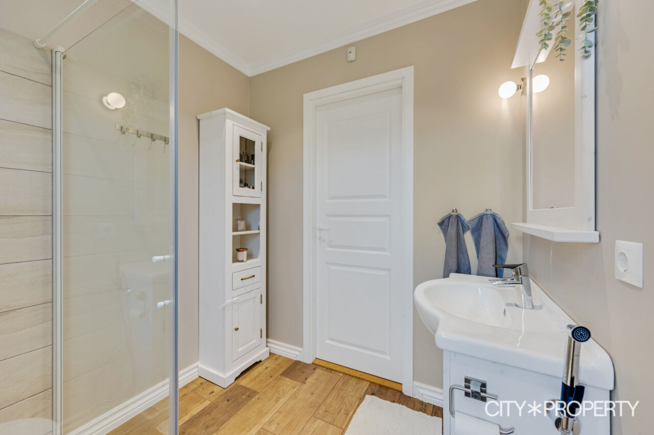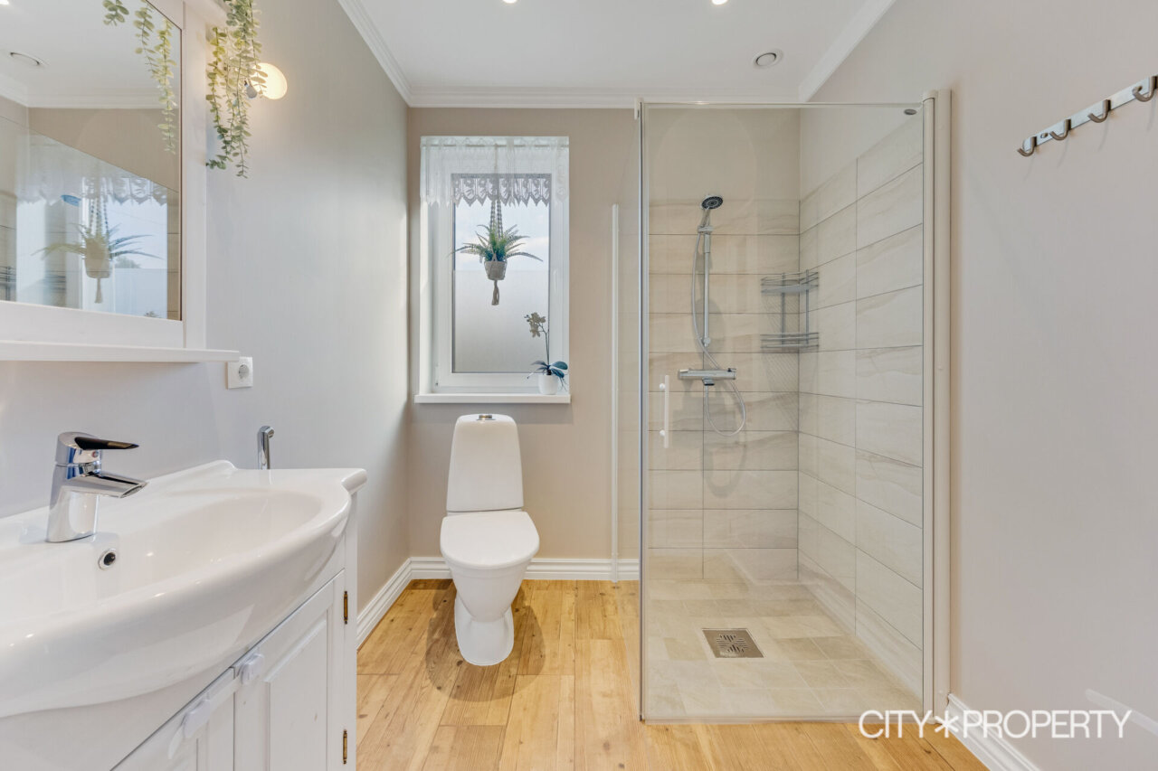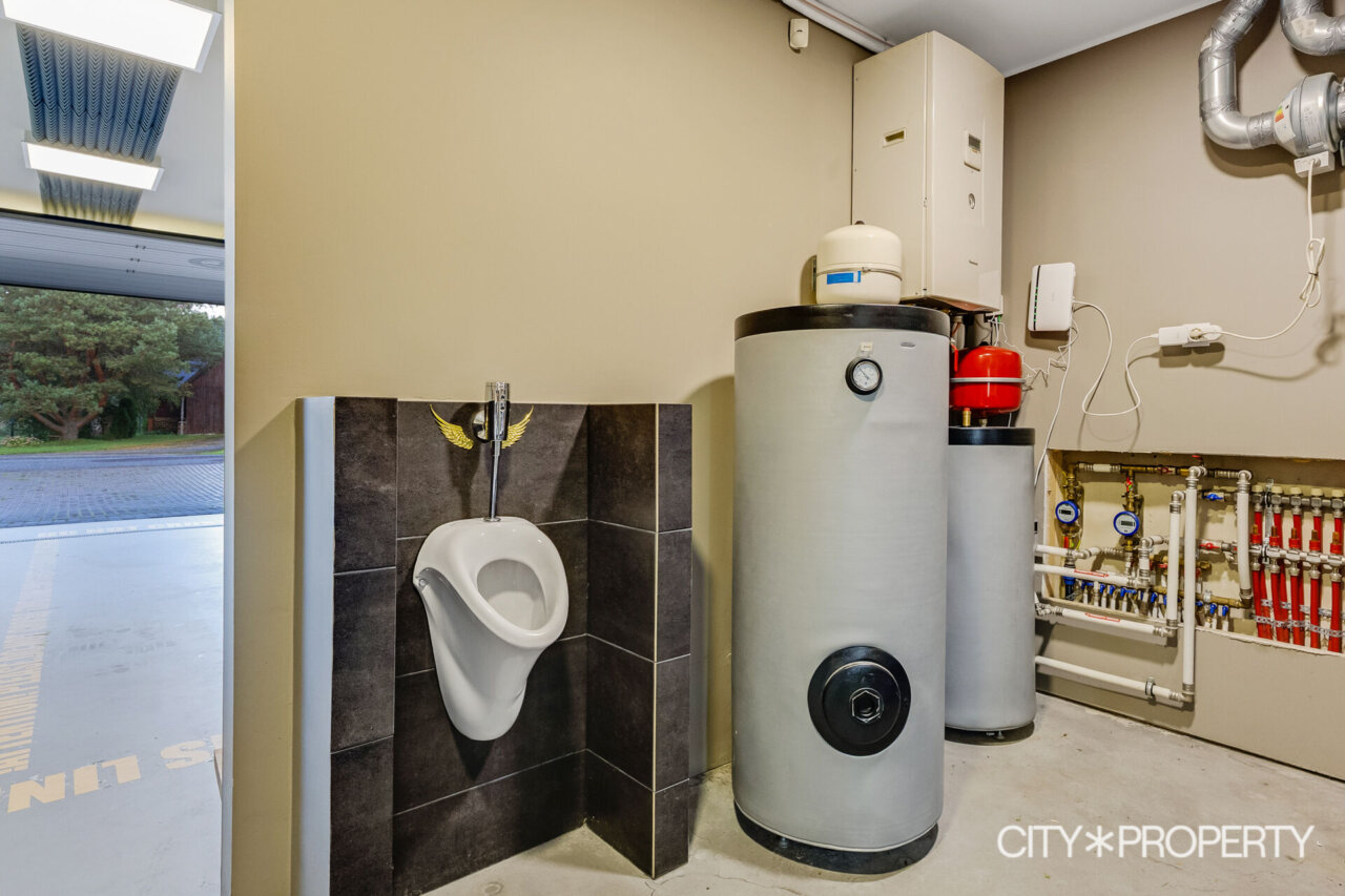 Majas on kaks WC-d ja kaks dušširuumi, samuti avar pesuköök ning saun koos eesruumiga, kust pääseb otse majatagusele terrassile. Katusealuse terrassi kaudu on ligipääs suurde garaaži (registreeritud töötoana) ja panipaika, kus paikneb maja küttesüsteem ning automaatloputusega pissuaar.
