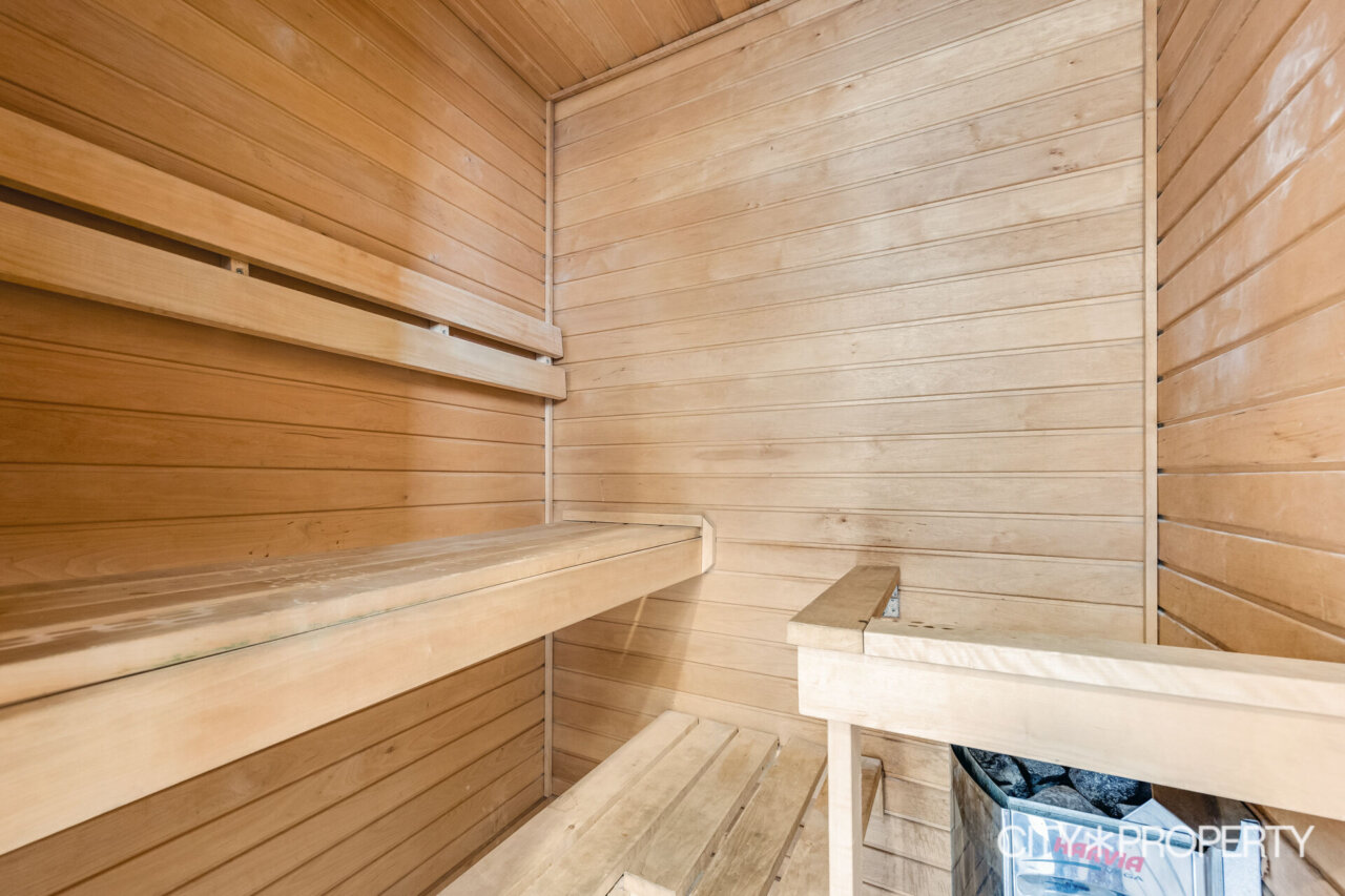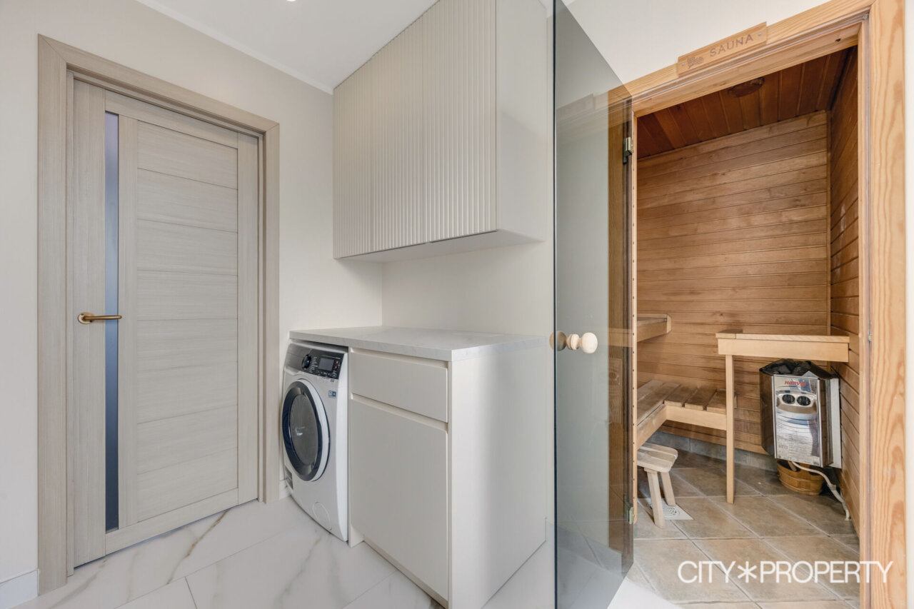 Suured aknad avanevad kahte suunda, tuues tuppa rohkelt loomulikku valgust. Samal korrusel asuvad ka saun, duširuum ja wc.