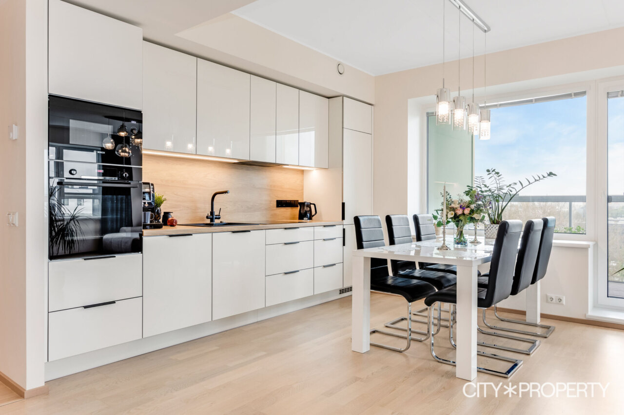 Köök on sisustatud kvaliteetse köögimööbli ja kodutehnikaga (elektripliit, elektriahi, mikrolaineahi, õhupuhasti, nõudepesumasin, külmik). Kööki ja elutub eraldab suur söögilaud koos 6 tooliga.