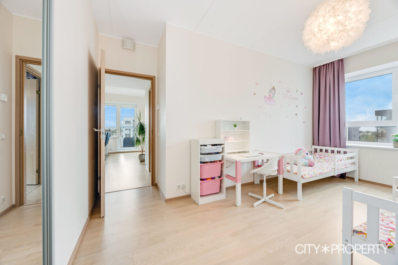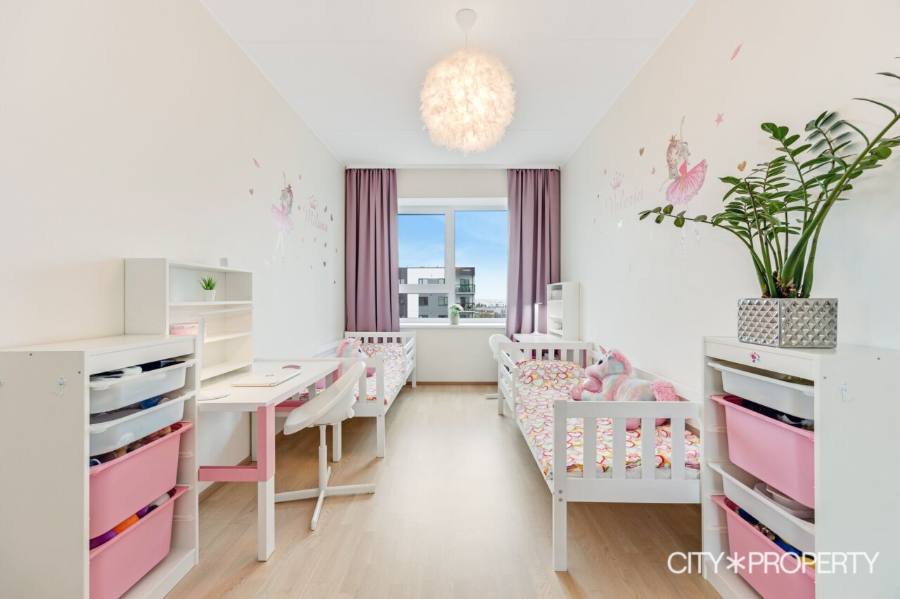 Korteri koosseisu kuulub avar L-kujuline esik koos mahuka garderoobikapiga, panipaik, eraldi asetsev wc, wc/vannituba, magamistuba koos garderoobikapiga, 2 lastetuba, elutuba koos avatud köögiga ning pääsuga klaasitud rõdule.
