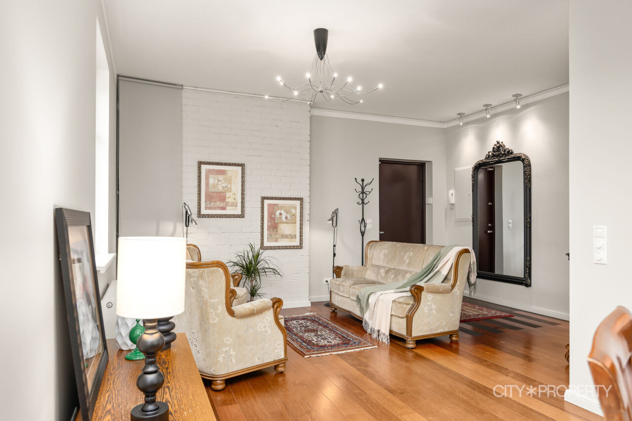 Elutoa ja köögi põrandat katab põrandalaud Merbau, magamistoas valgeks õlitatud tammeparkett, vannitoas põrandaplaat koos põrandaküttega ja Lincona niiskuskindel vinüülpõrand.