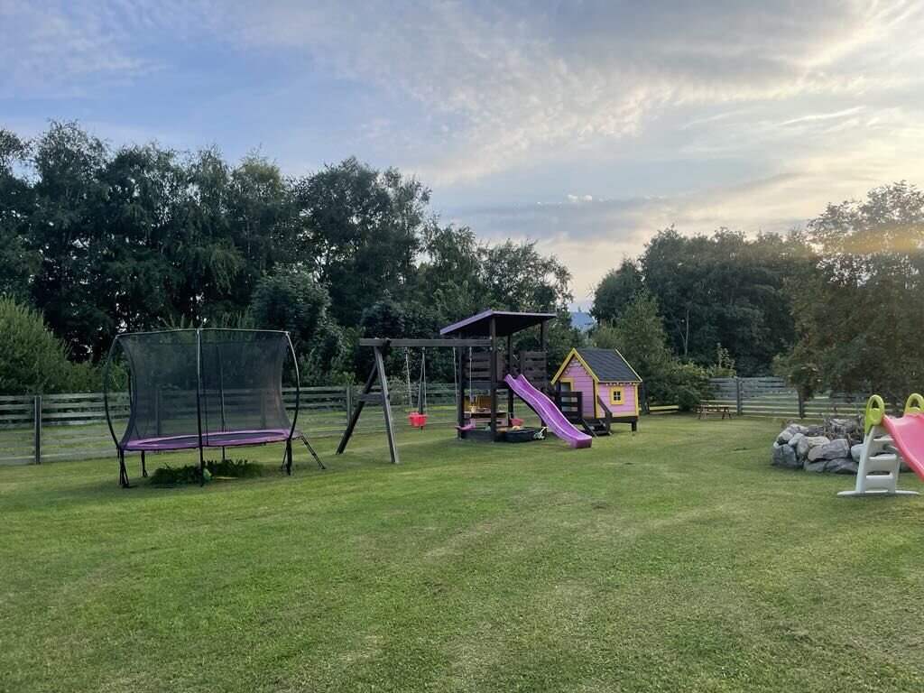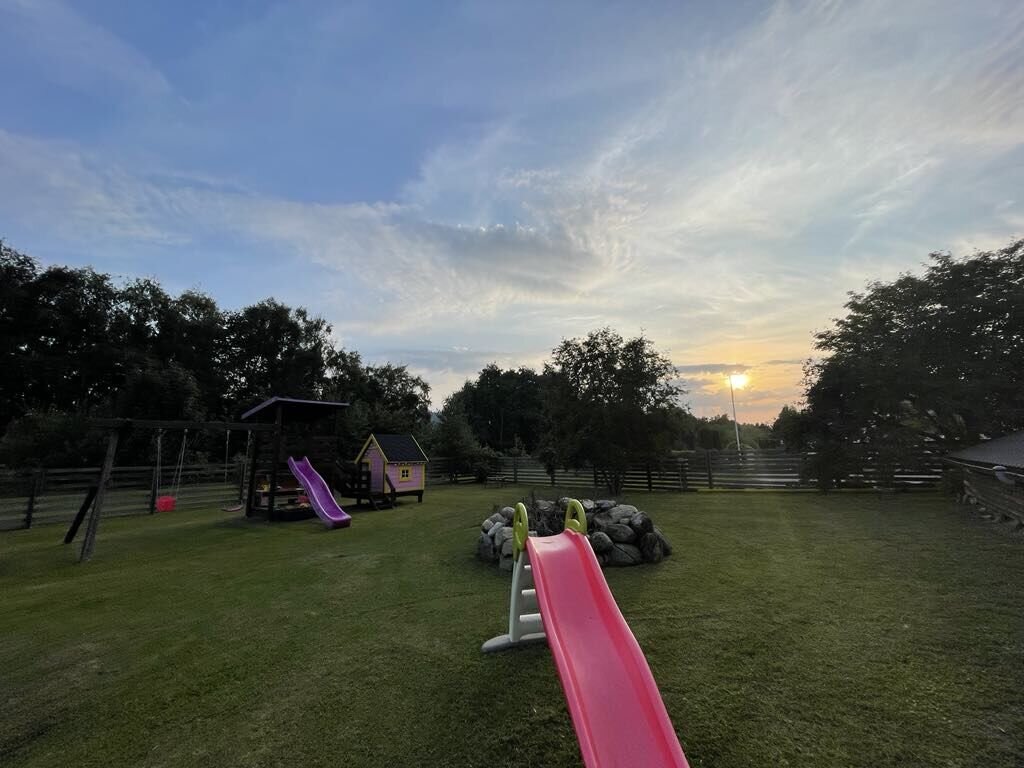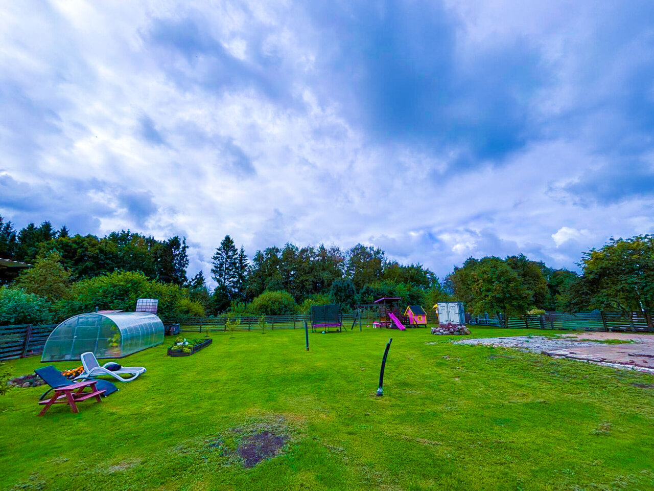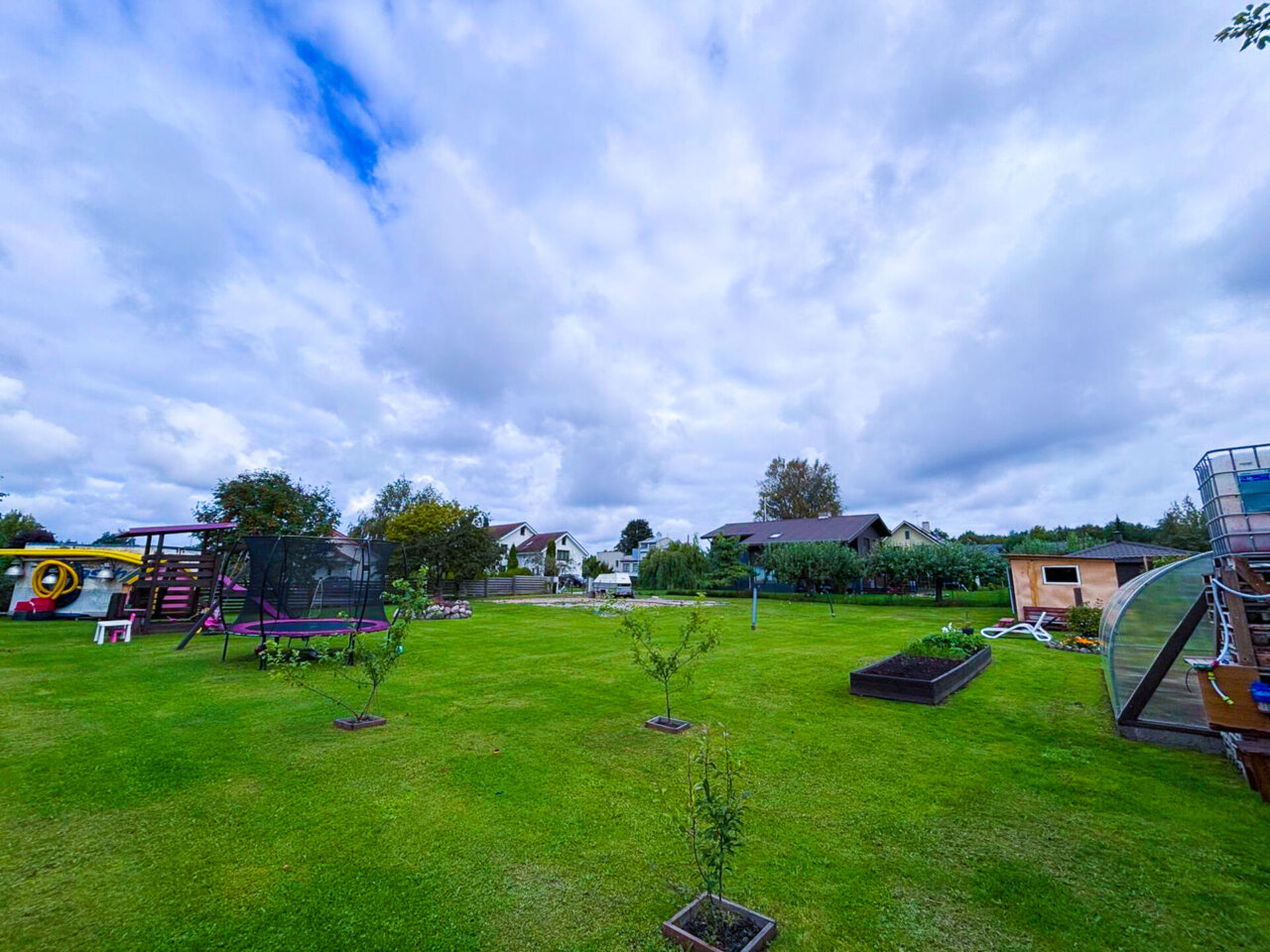 Hetkel hoonestatus: eraldi vundamendil 3×6 kasvuhoone, suur laste mänguväljak majakesega.
