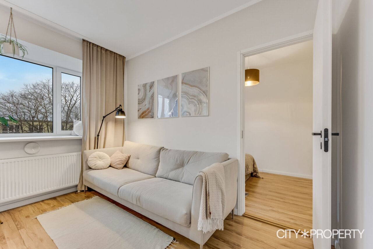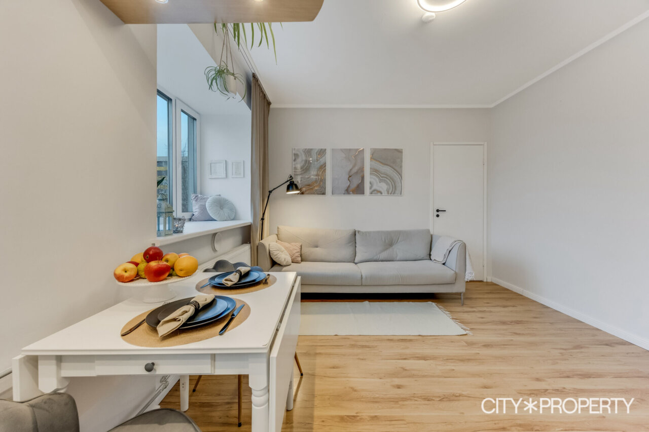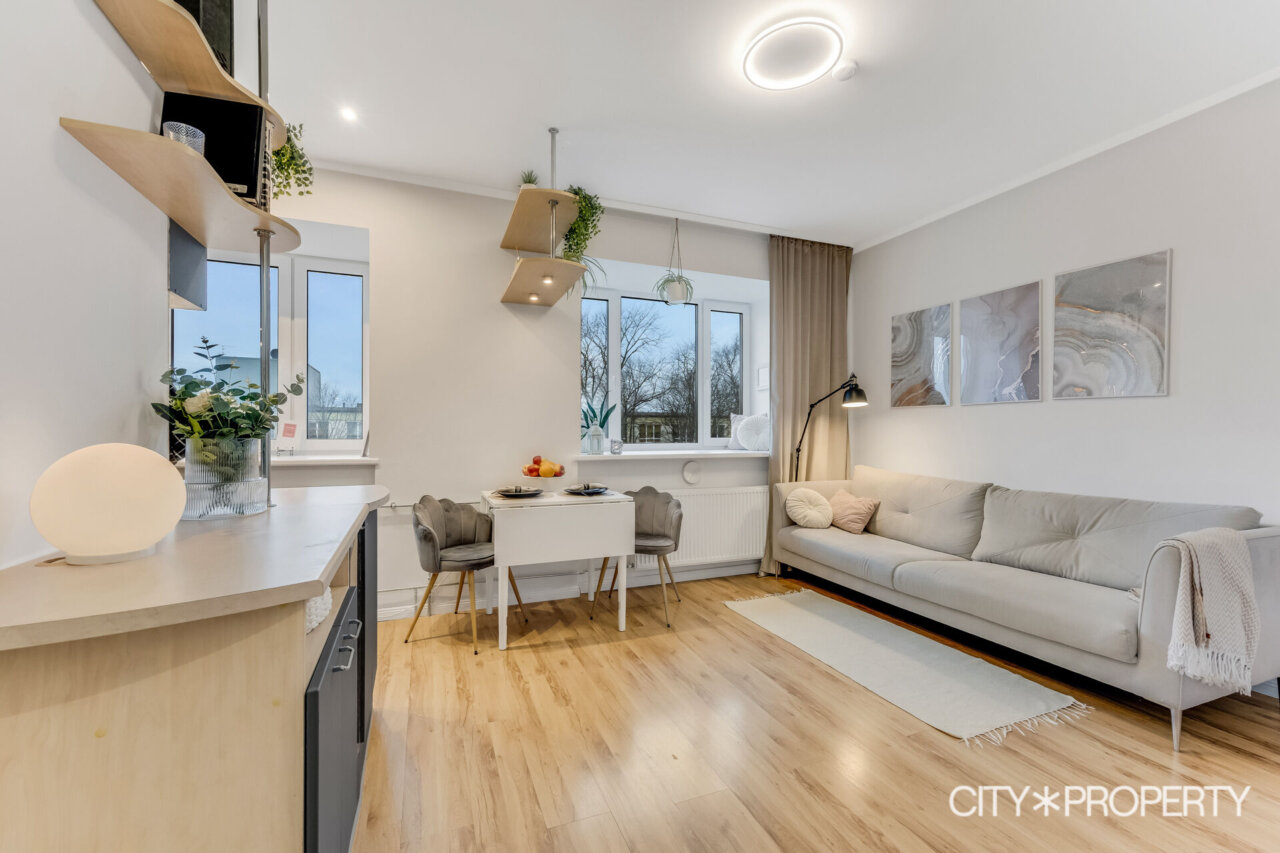 Korteri üldpind on 34 m², kuid tänu läbimõeldud ruumiplaneeringule on korter väga avar. Korteri koosseisu kuuluvad esik, elutuba avatud köögiga, magamistuba, WC/vannituba. Korter on valgusküllane ja ainulaadselt sügavate aknalaudadega, mis lisavad avarust, köögile töötasapinda ja kuhu saab elu- või magamistuppa teha õdusa zen-pesa. Suvel avanevad akendest vaated rohelusele tänu ümbritsevatele puudele, mis loovad privaatsust ja rahuliku atmosfääri.