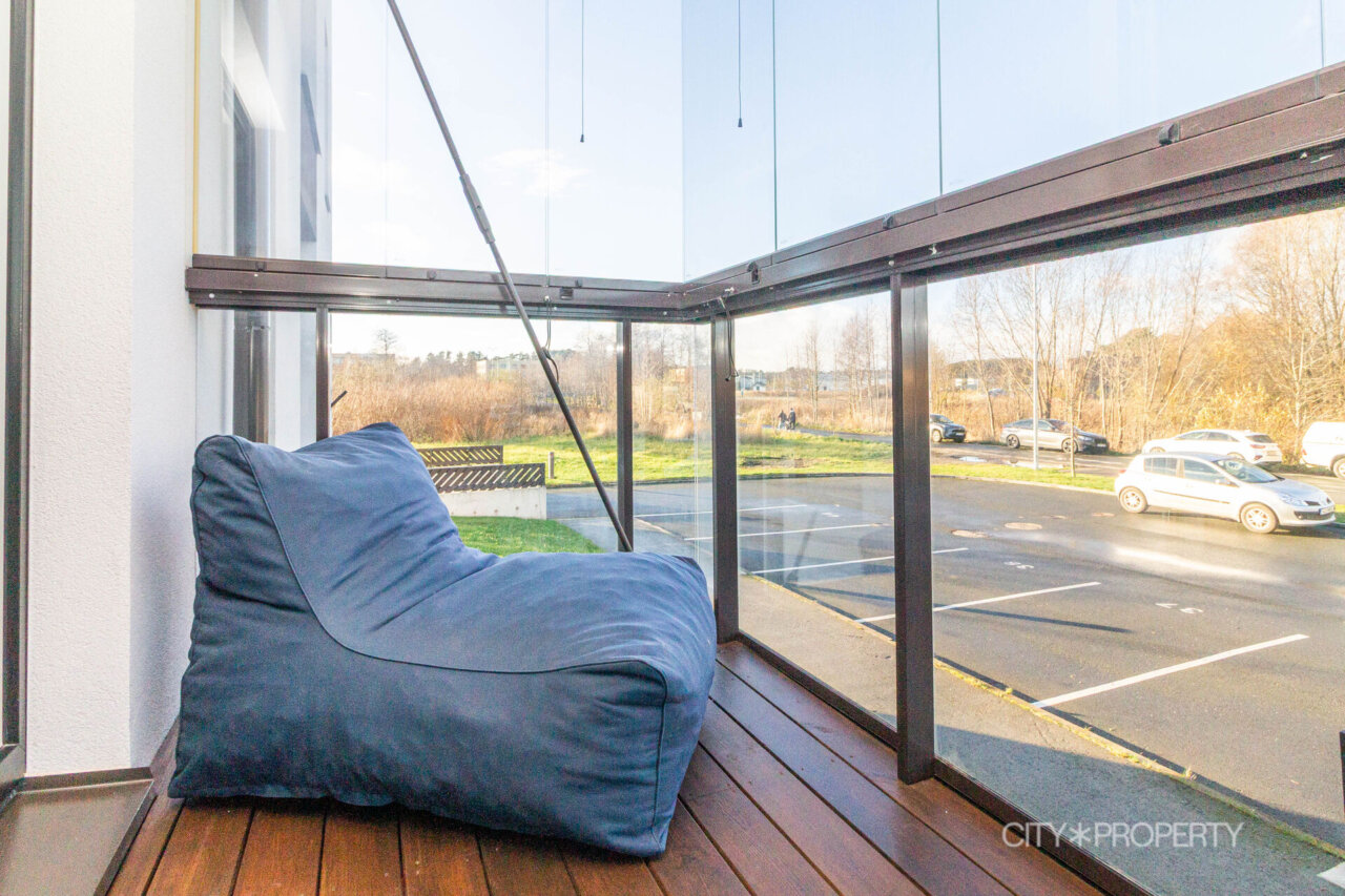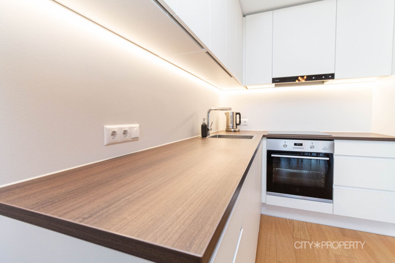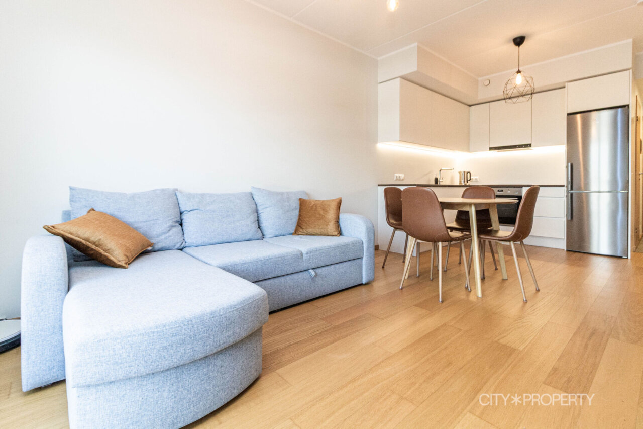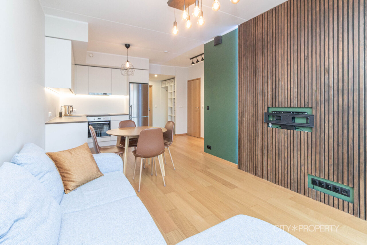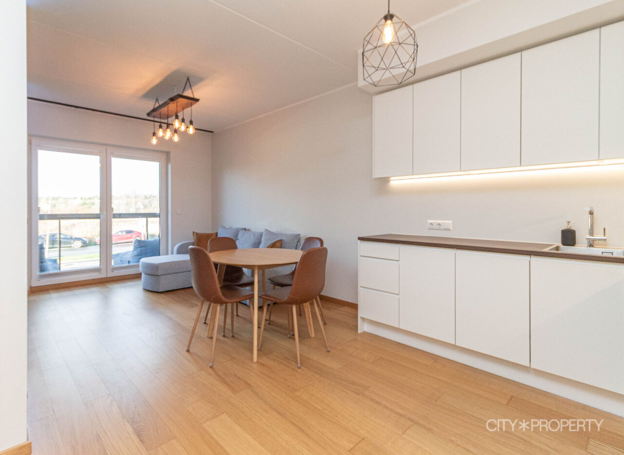 Korter on avatud planeeringuga ja õhtupäikese poolne (ilusad päikeseloojangud). Elamispind 44,5m2 ja klaasitud rõdu 3,9m2. Korteri koosseisu kuuluvad: esik koos sissehitatud garderoobikappiga, elutuba avatud köögiga ja tehnikuga(külmkapp, ahi, pliit, nõudepesumasin), magamistuba kus on hämarduvad juhtmevaba lülitiga valgustid, madratsiga voodi ja mahukas garderoobikapp. Elutoas on diivani-voodi ja söögilaud koos toolidega. Korteri elutoale lisab avarust moodne klaasitud rõdu, mis lisab igapäevaelule mitmeid mugavusi ja eeliseid. Magamistuppa toovad valgust suured maast laeni aknad.