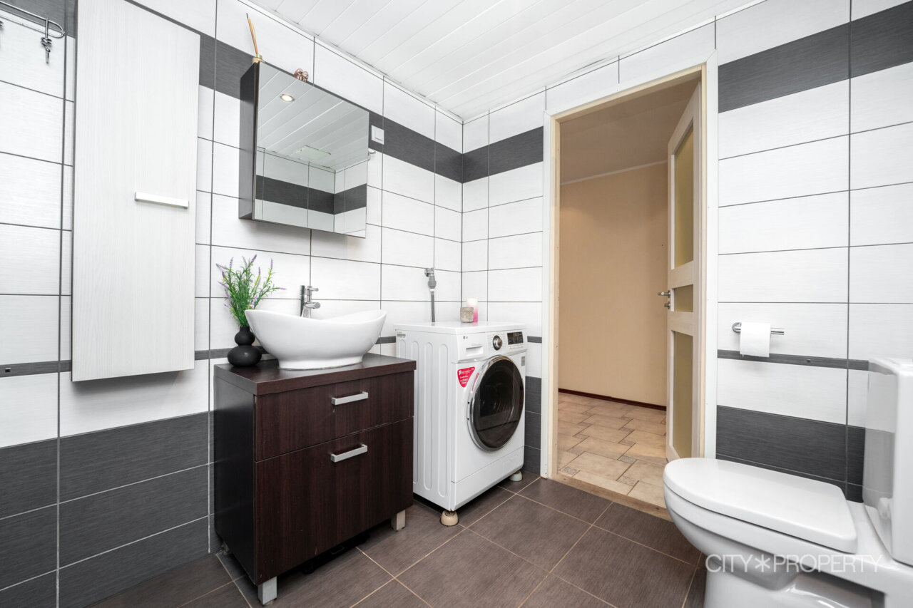Esik, vannituba ja köögi esine plaatitud. Vannitoas ja esikus põrandaküte. Põrandaid katab parkett.