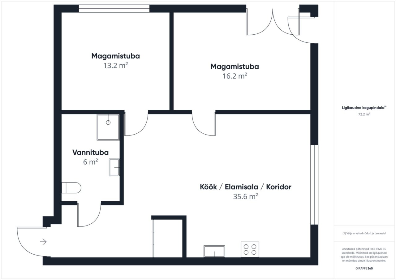 Korteri koosseisu kuuluvad avar elutuba koos avatud köögiga, kaks eraldi magamistuba, wc/vannituba ning esik.