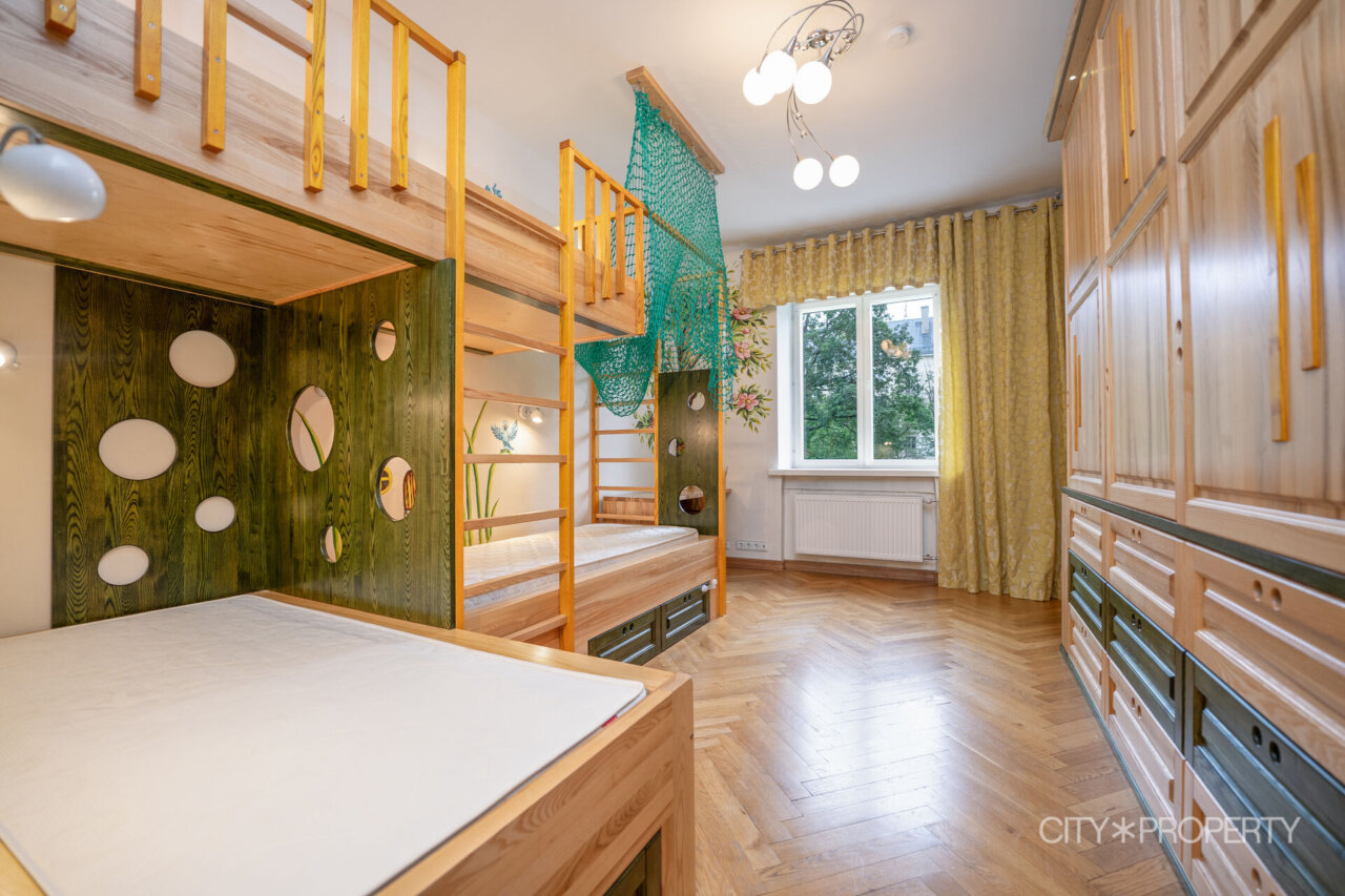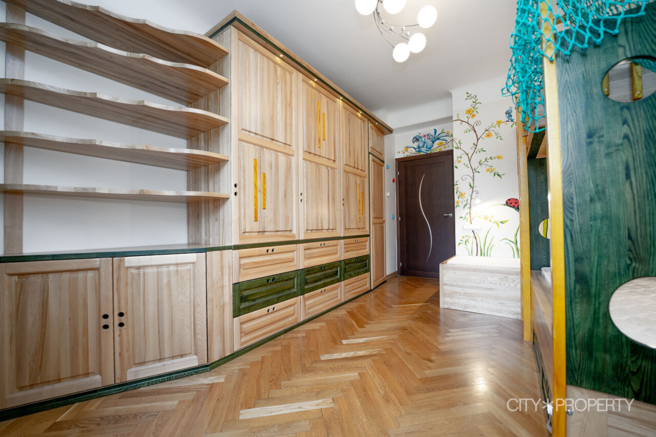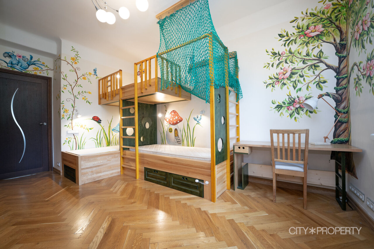 Lastetoas ootab lapsi armastusega loodud sisustus – saarepuidust eritellimusmööbel, kuhu kuuluvad mahukas riidekapp, kolmekohaline voodi, kirjutuslaud ja toolid. Lisamugavust ja mängulisust lisab laest rippuv võrkkiik.