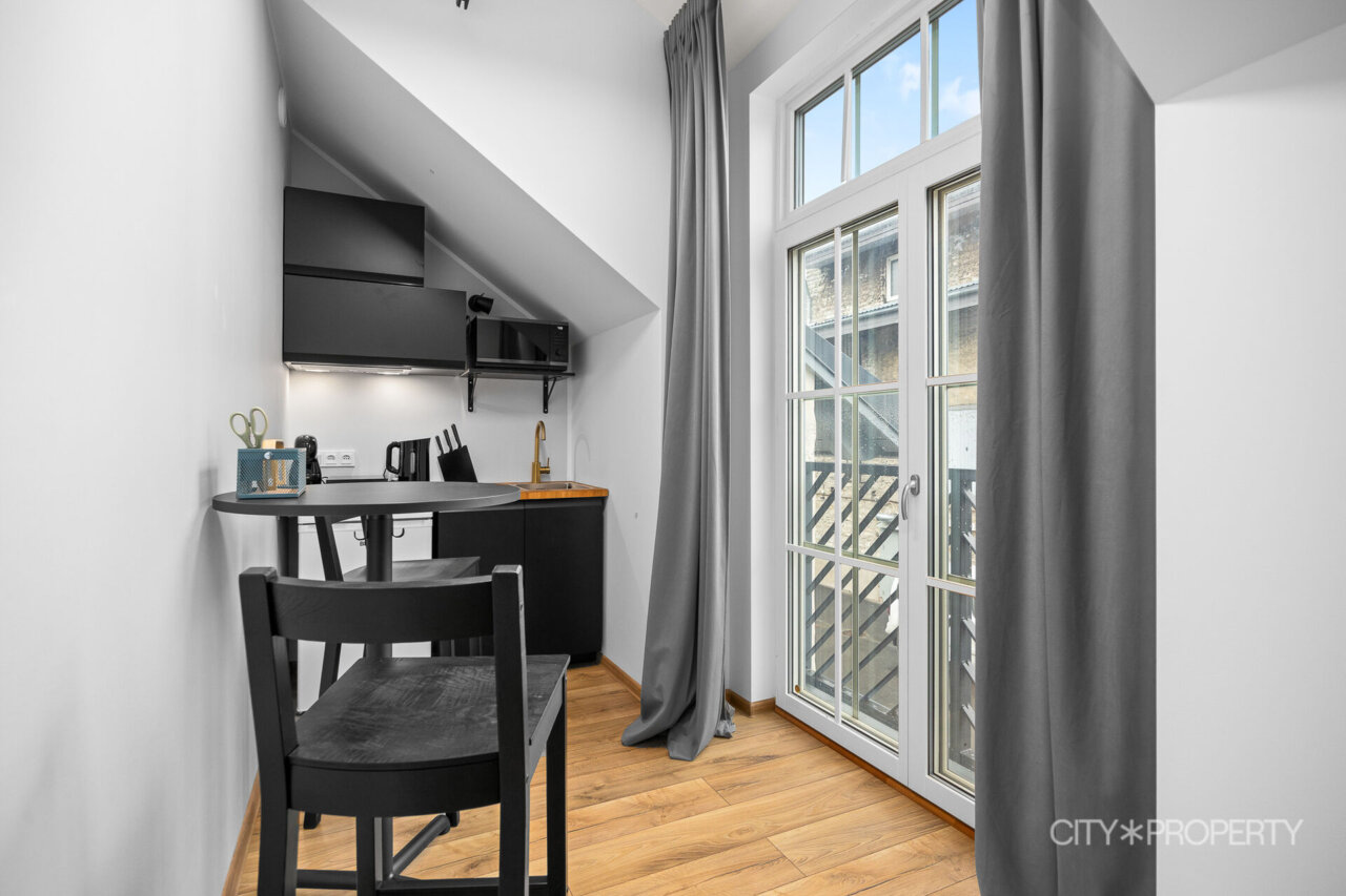 II korrus: kokku 12 väikest korterit (kompaktsed ja funktsionaalsed planeeringud), 4 möbleeritud ja toimivad majutusüksused, 8 korterit valmis sisustamiseks ja ärimudeli laiendamiseks. Lähiajal sisustatakse ka need 8 korterit ära. Kõik korterid soojustatud, viimistletud ja kööginurga valmidusega. Hoone arhitektuur on inspireeritud klassikalisest stiilist, fassaadil säilitatud ajaloolised detailid ja krohvipinnad. Ehitisel on energiatõhus põrandaküte ja sundventilatsioon, mis tagavad madalad halduskulud.