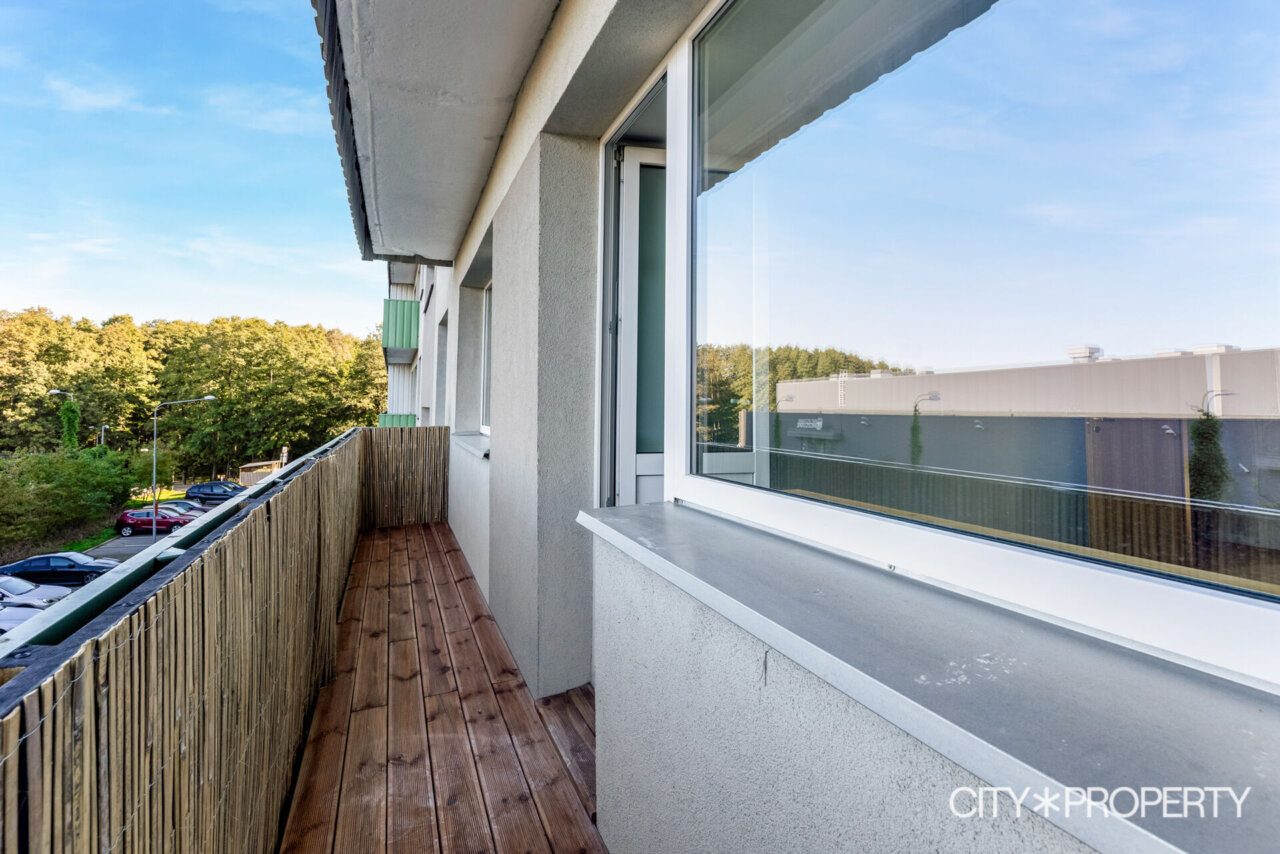 Korteri koosseisu kuulub esik koos garderoobikapiga, hubane elutuba, eraldi asetsev avatud köök, 2 magamistuba, kus on sisseehitatud garderoobikapid ja millest ühel on pääs rõdule ja duširuum/ wc.