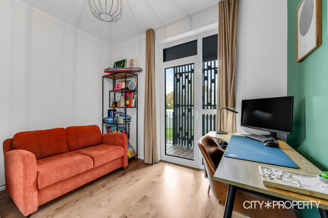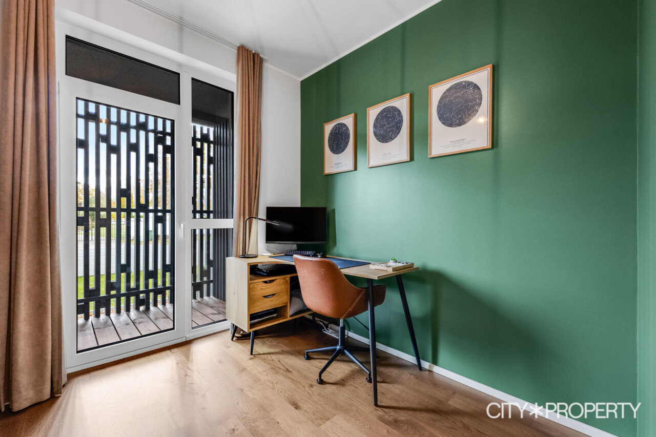 Kolmas magamistuba/ kodukontor – Sellest ruumist pääseb 4.3 m² suurusele hommiku- ja päevapäikese poolsele rõdule, kus võib juba varakevadel tuulevaikses nurgas päikest võtta. Kontorituppa võib jääda riiul ja diivan.