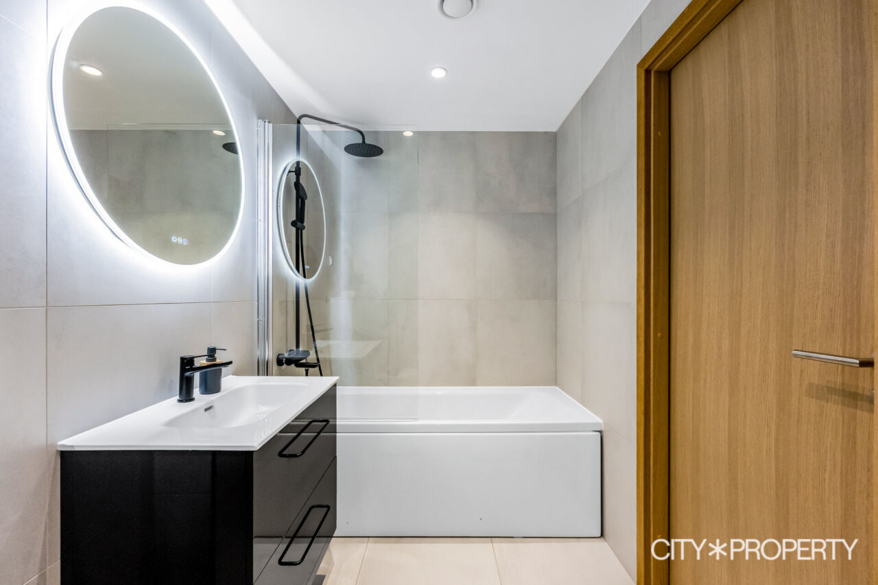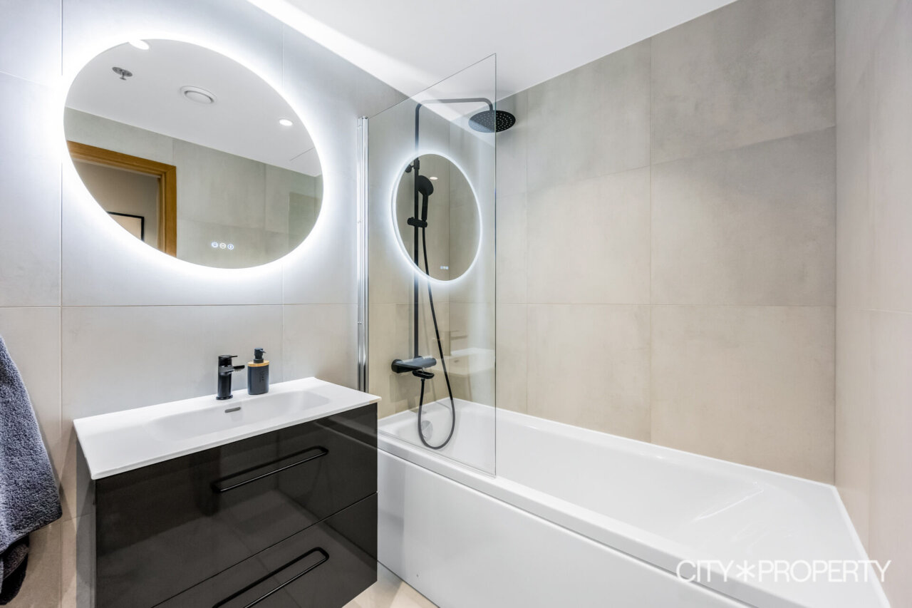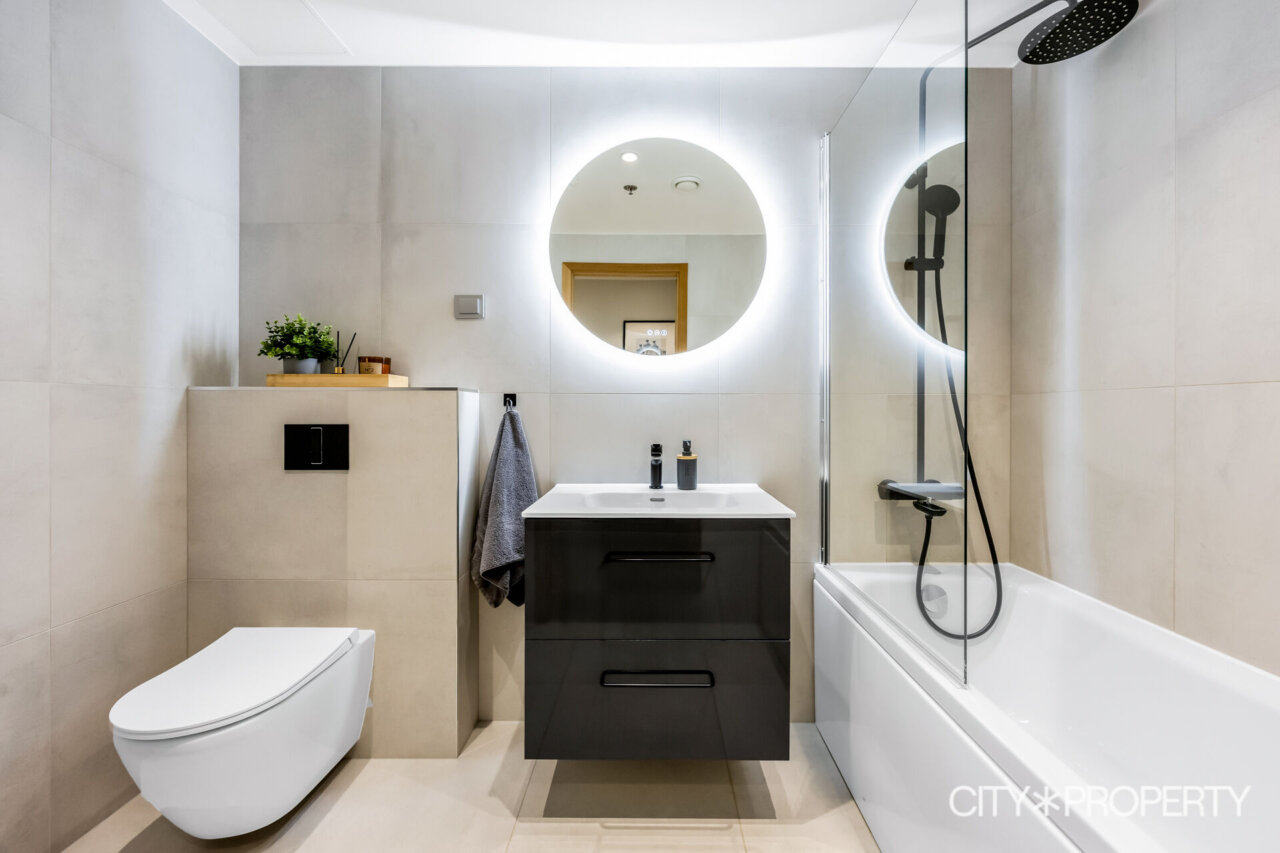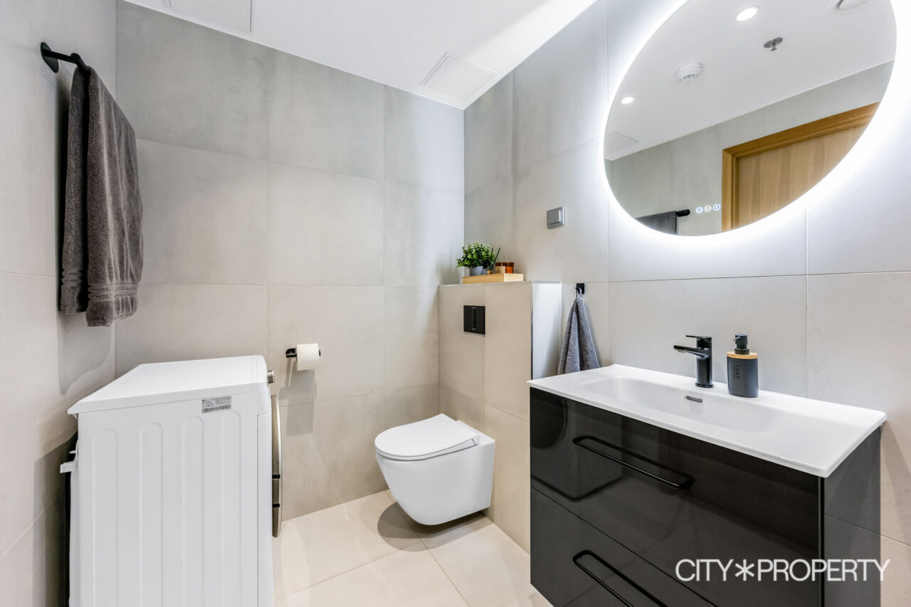 Vannitoa seinad ja põrand on kaetud suureformaadilise heleda kiviplaadiga ja segistid on valitud mattmusta pinnaviimistlusega.