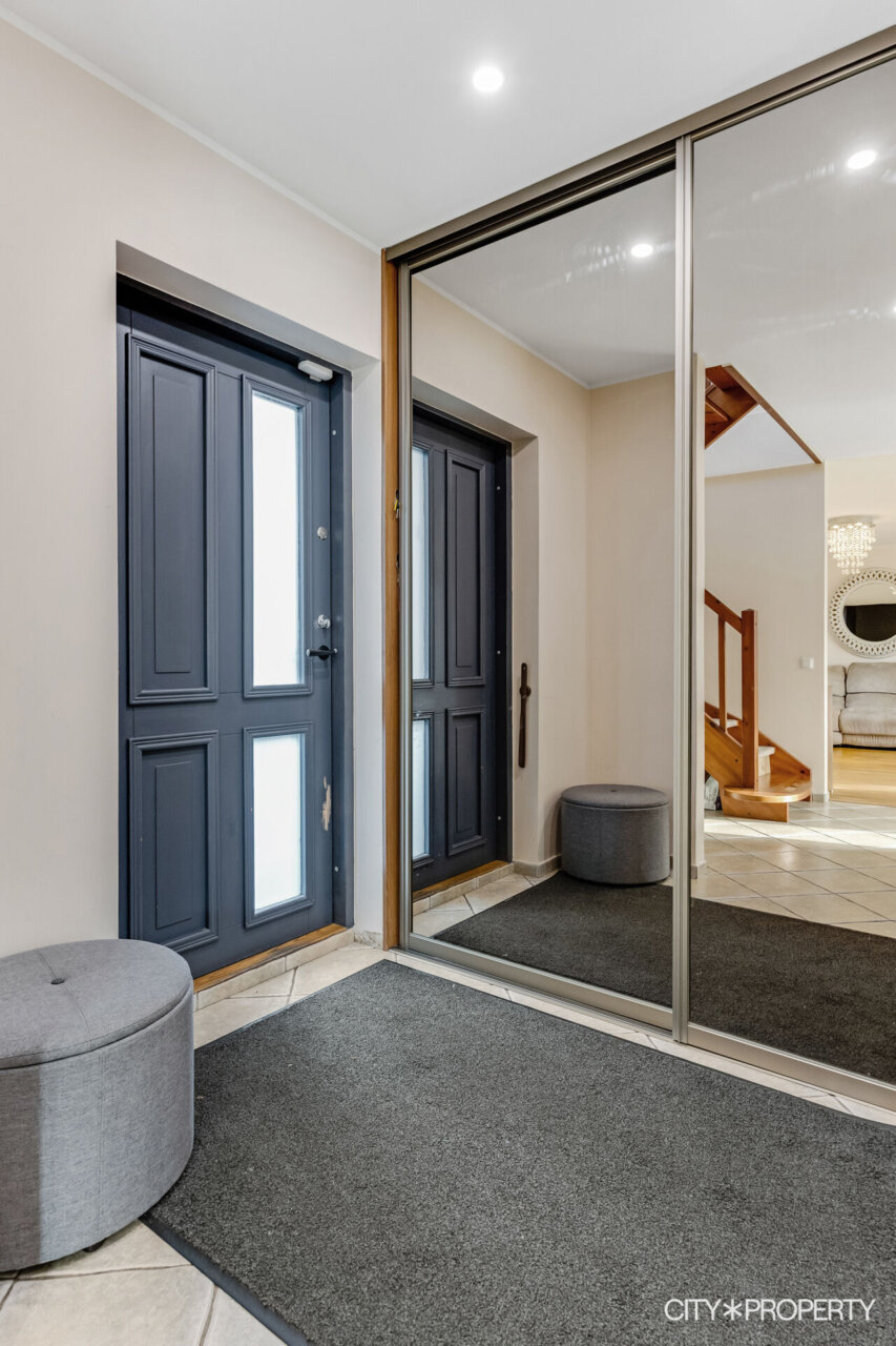 Välisseinad on soojustatud villaga ja viimistletud hele- ja tumehallide krohvipindadega, mida elavdavad hallikas toonis puitribid. Aknad ja terrassiuksed on puit-alumiiniumist, energiatõhusate klaaspakettidega.