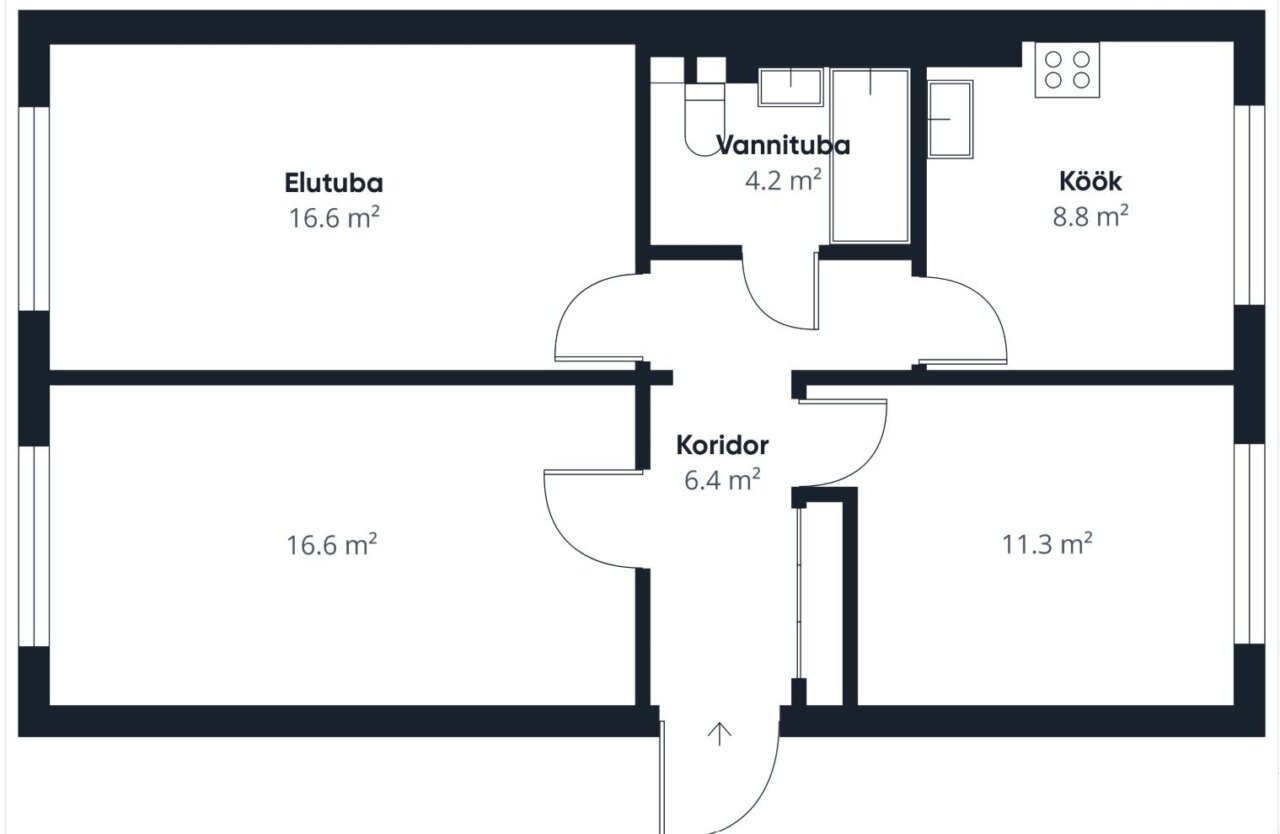 Korteri pind on 63,3 m². Korteril on mugav ja avar planeering – köök, 3 eraldi tuba, vannituba/WC.