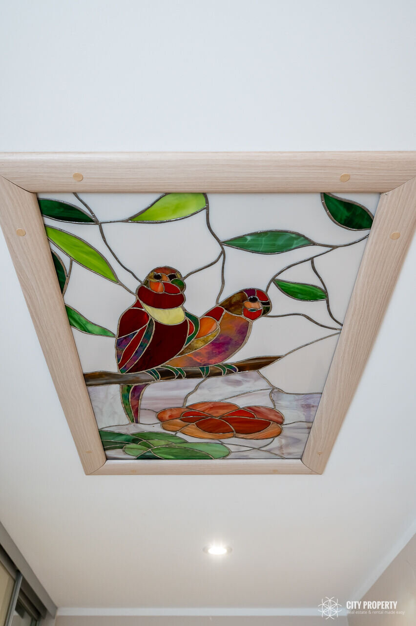 Seinad on sirgendatud, krohvitud ja värvitud, osaliselt tapeeditud. Koridoris on laes vitraažid, mis loovad hubase meeleolu.