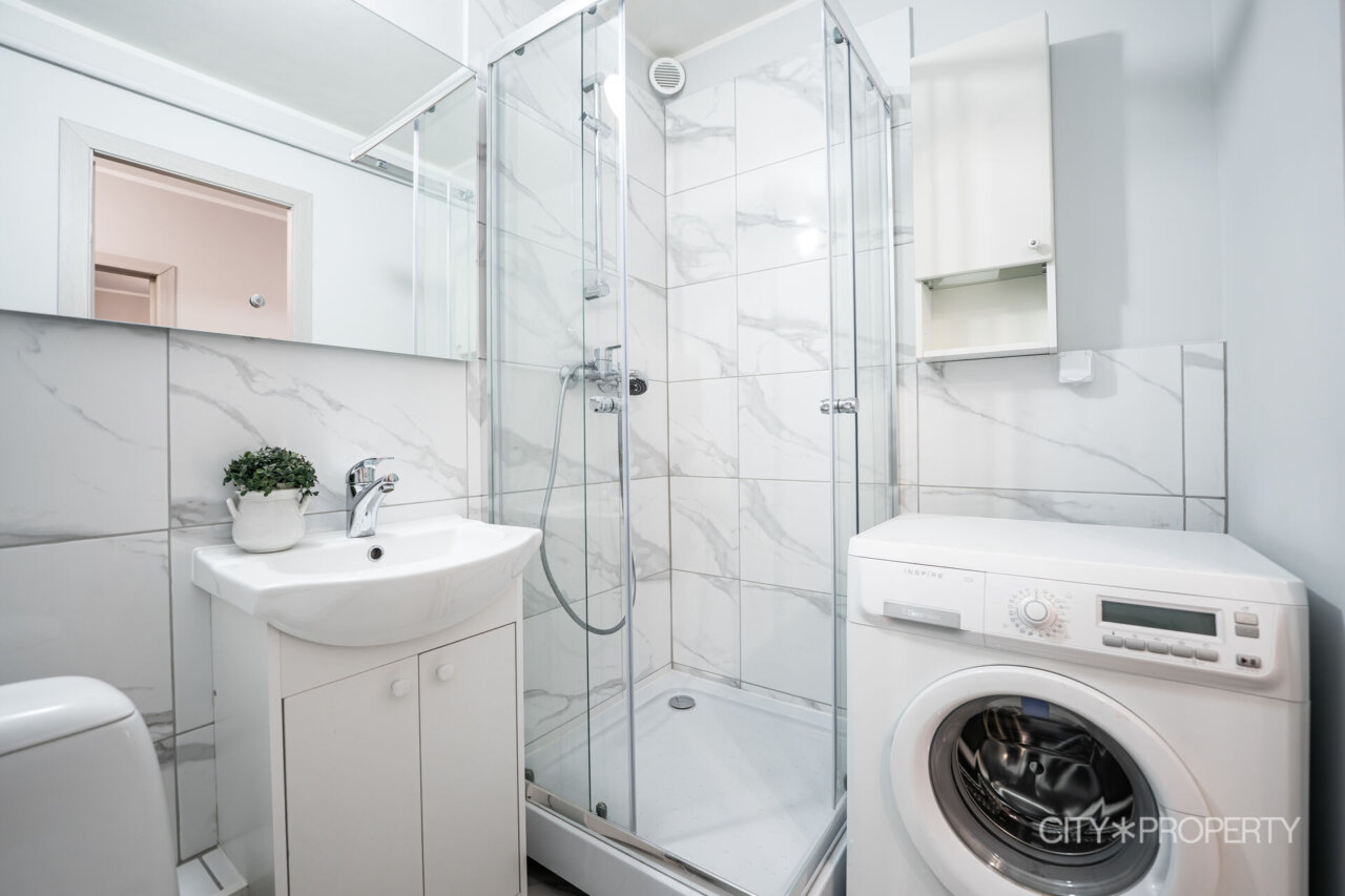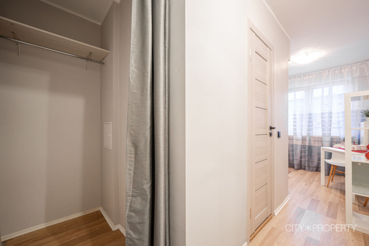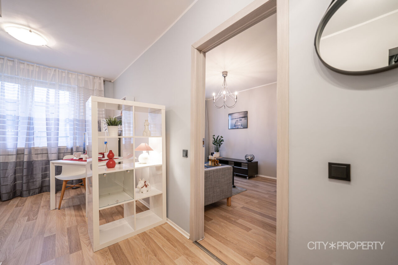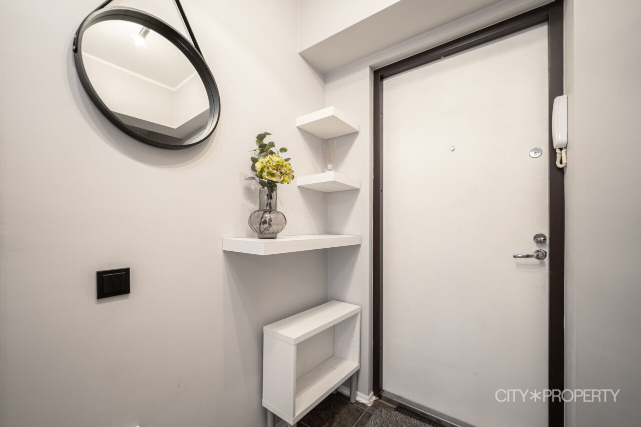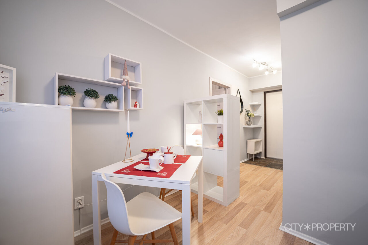 Korterisse sisenedes leiate end esikust, millest vasakule jääb mahukas garderoob. Edasi jääb maitseka ja kvaliteetse siseviimistlusega wc-duširuum. Esikust otse jääb 9m2 köök, mis mahutab kenasti lisaks köögimööblile ja tehnikale (gaasipliit, praeahi, külmkapp, kubu) väikese söögilaua. Esikust paremale jääb privaatse magamisnurgaga elutuba.