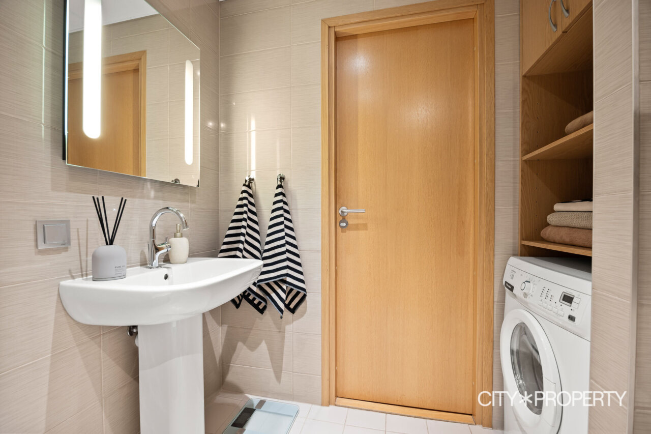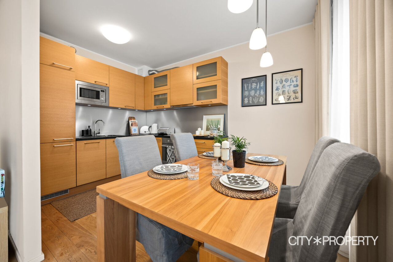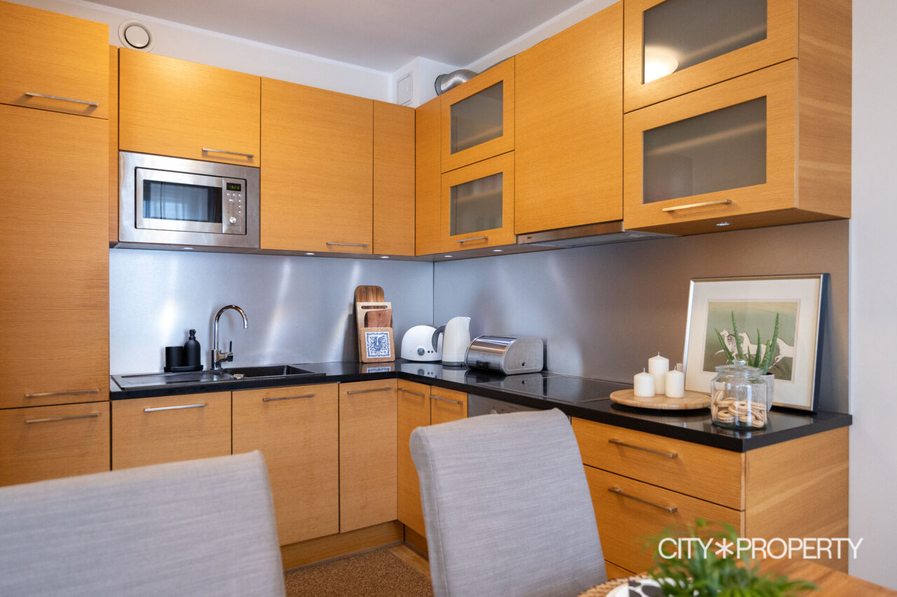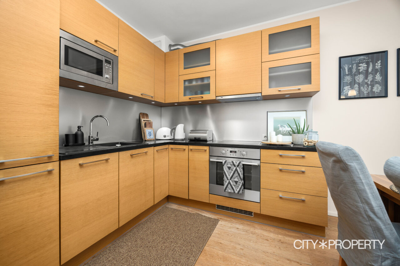 Elutuba koos köögialaga on avar ja valgusküllane tänu suurtele maani akendele, mis loovad ruumile õhulise ja avara tunde. Köök on varustatud kogu vajaliku kvaliteetse kodutehnikaga: keraamiline elektripliit, elektriahi, kubu, nõudepesumasin ja külmkapp. Esikus asuv sisseehitatud garderoob pakub mugavat ja varjatud hoiuruumi üleriietele ja jalanõudele. Vannituba on praktiline ja maitsekas, olemas dušinurk ning pesumasin. Korter on ühtne tervik, mis sobib inimesele, kes hindab kvaliteeti, vaikust ja hästi toimivat ruumilahendust.