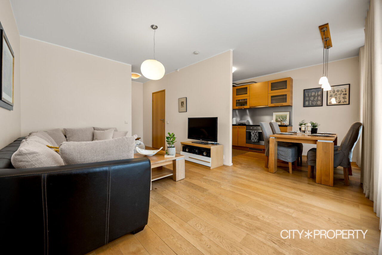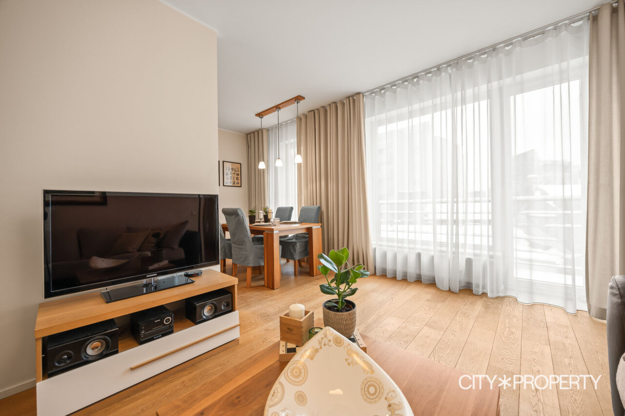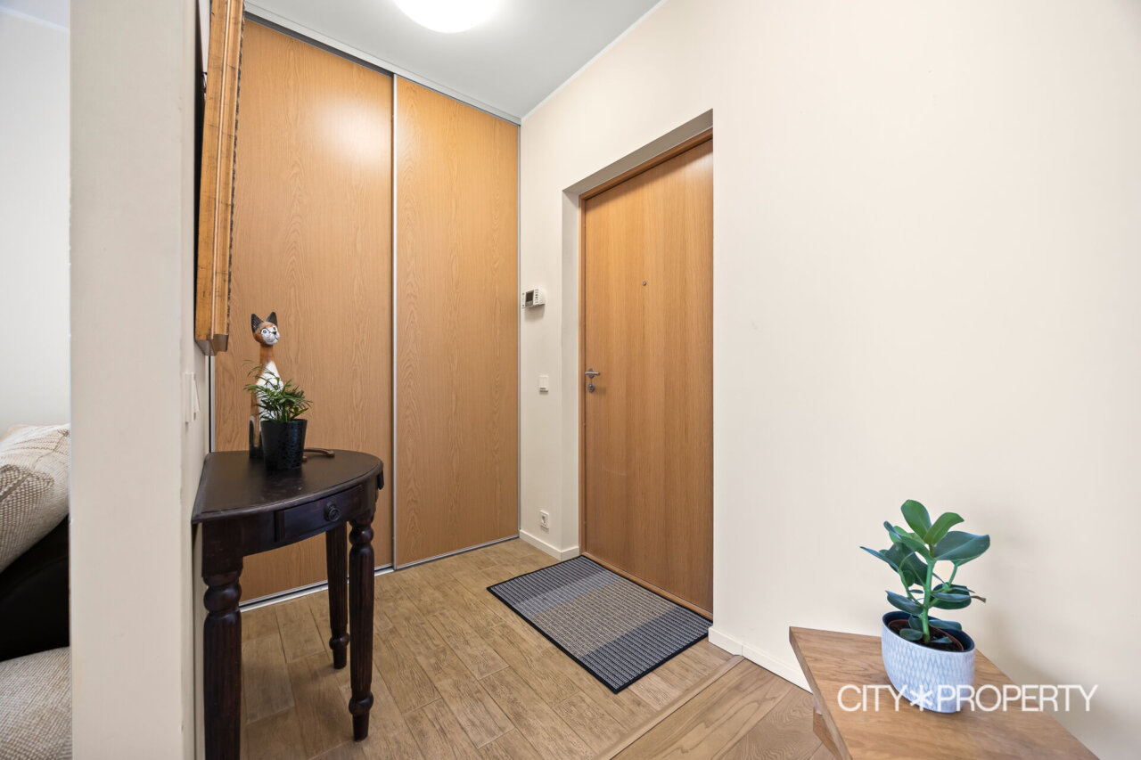 Korteri on avar ja funktsionaalne: elutuba koos avatud köögiga, eraldi magamistuba, esik ruumika garderoobikapiga ning vannituba. Planeering on loogiline ja praktiline, pakkudes piisavalt privaatsust nii elamiseks kui töötamiseks kodukontoris. Seinad on viimistletud heledates, ajatu stiiliga toonides. Tubade põrandaid katab naturaalne tammeparkett ning esikus ja vannitoas on vastupidav keraamiline plaat.
