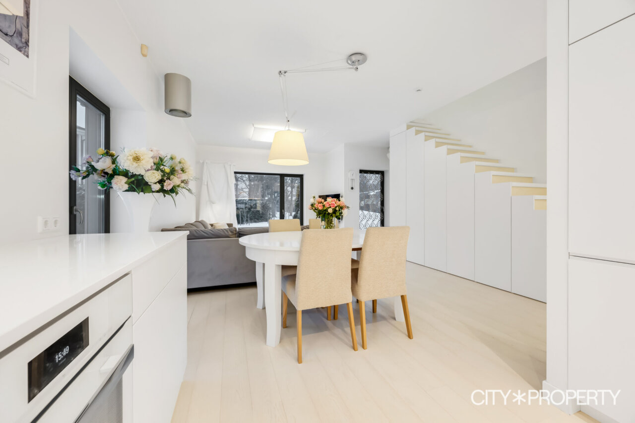 Majja sisenedes on avar esik, kus olemas garderoobikapp, kuhu mugav paigutada üleriided ja jalanõud ning eraldi tualett. Esimesel korrusel on tõeliselt valgusküllane, ruumikas elutuba koos avatud köögiga, kust pääs privaatsesse sisehoovi ja sauna. Sauna eesruumist, kui ka elutoast on pääs päikeselisele terrassile. Kööki sisustab kvaliteetne köögimööbel koos integreeritud tehnikaga (induktsioonpliit, elektriahi, kubu, külmkapp, nõudepesumasin). Esimesel korrusel olemas saun koos dušširuumiga, pääsuga terrassile, kus mõnus ennast jahutada pärast saunamõnusid.