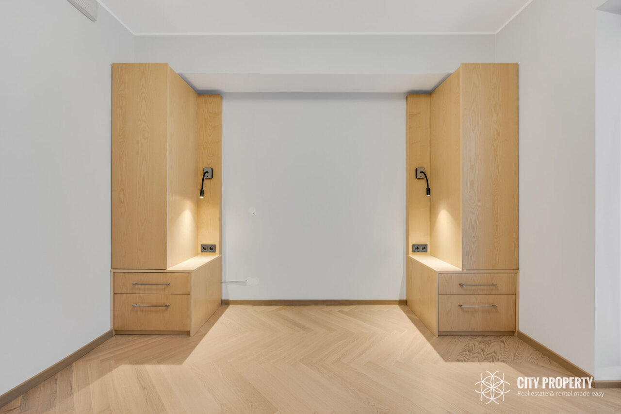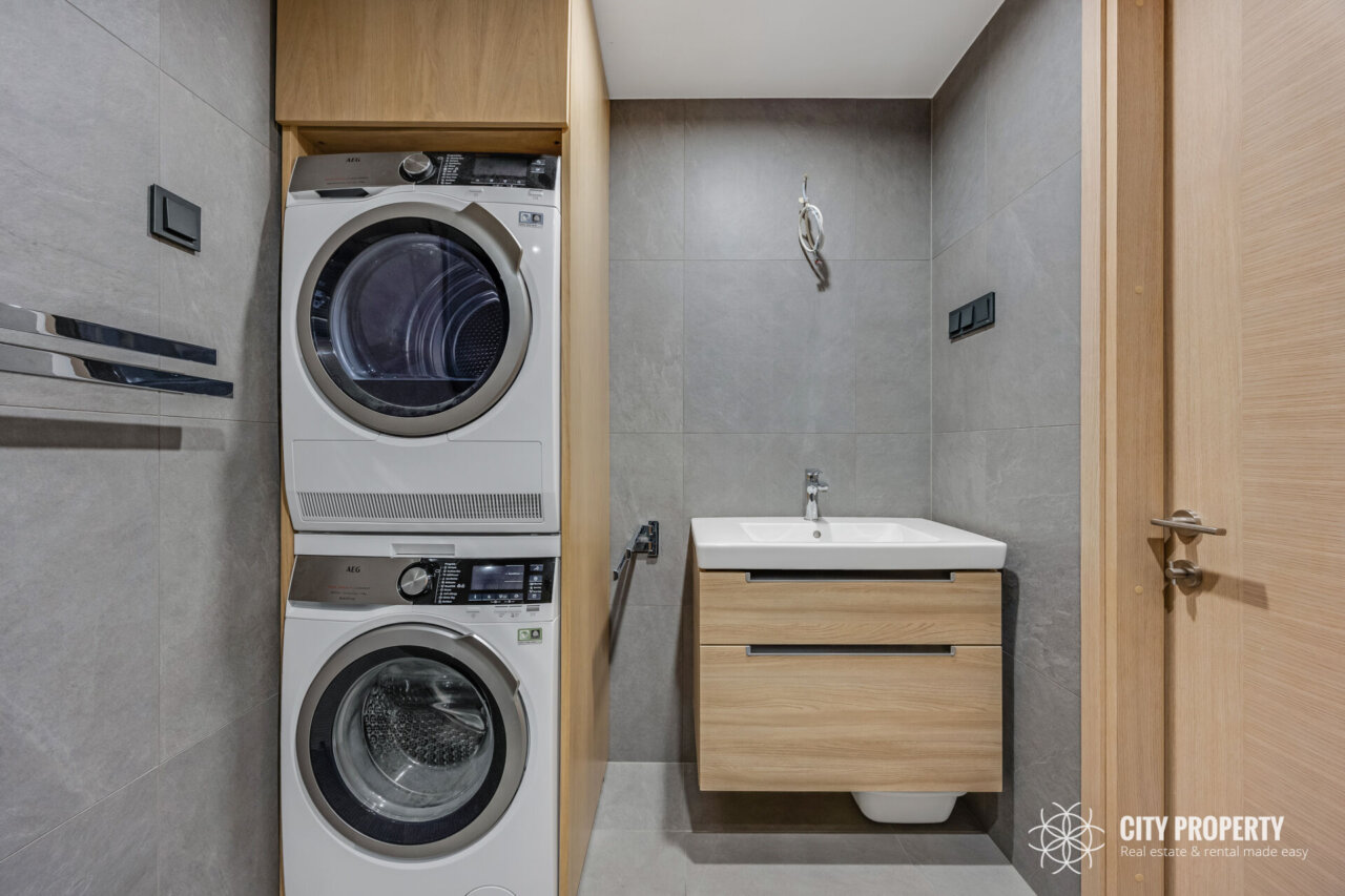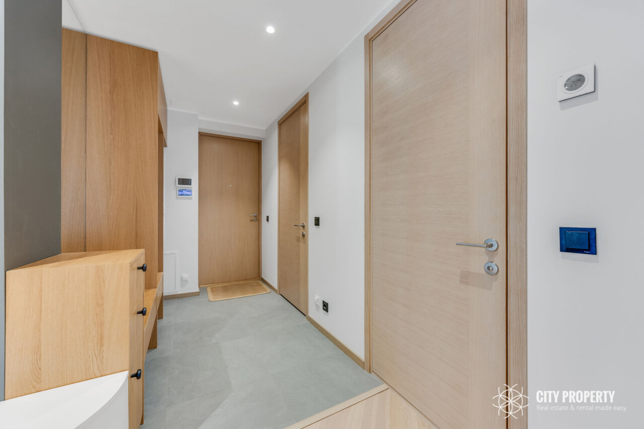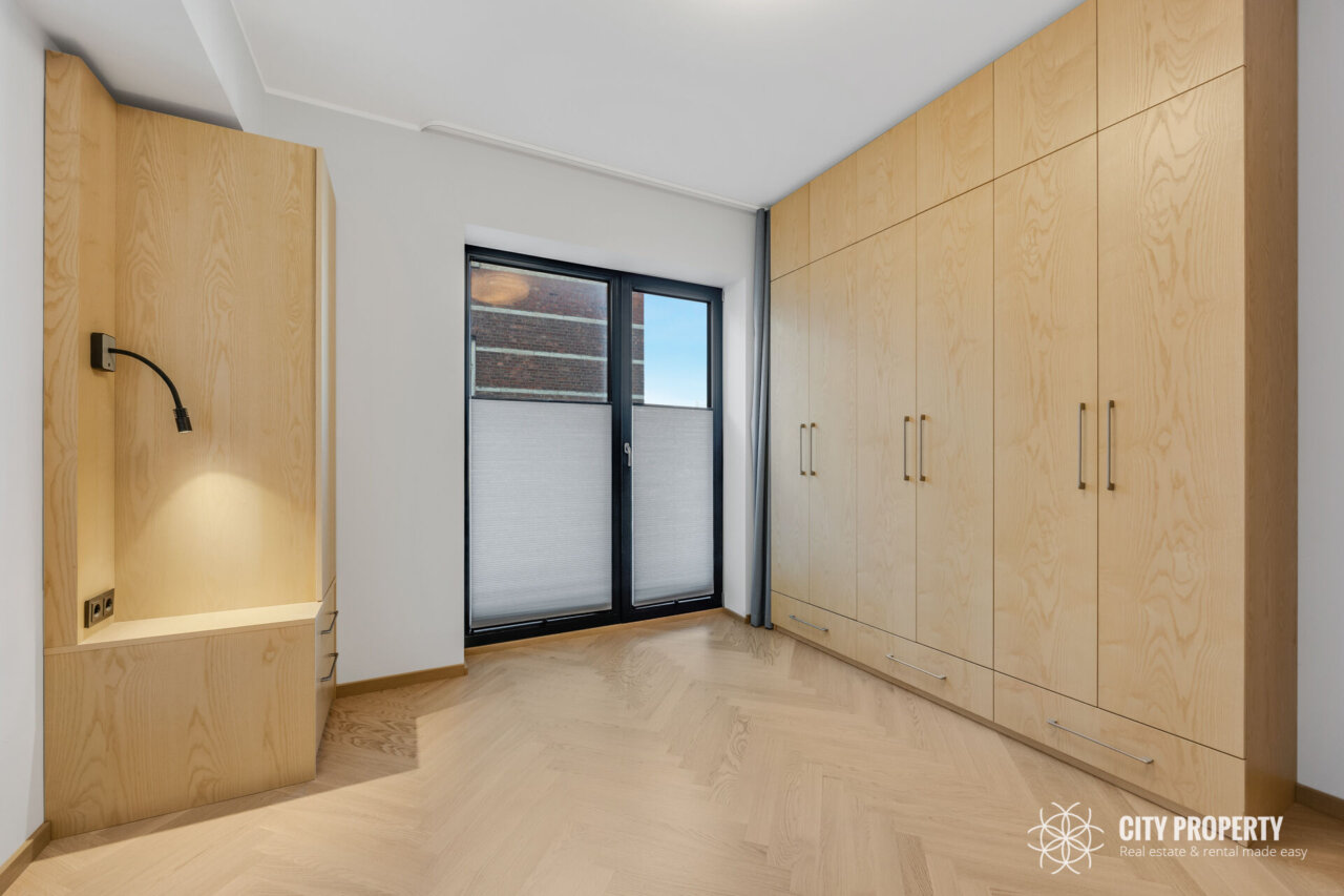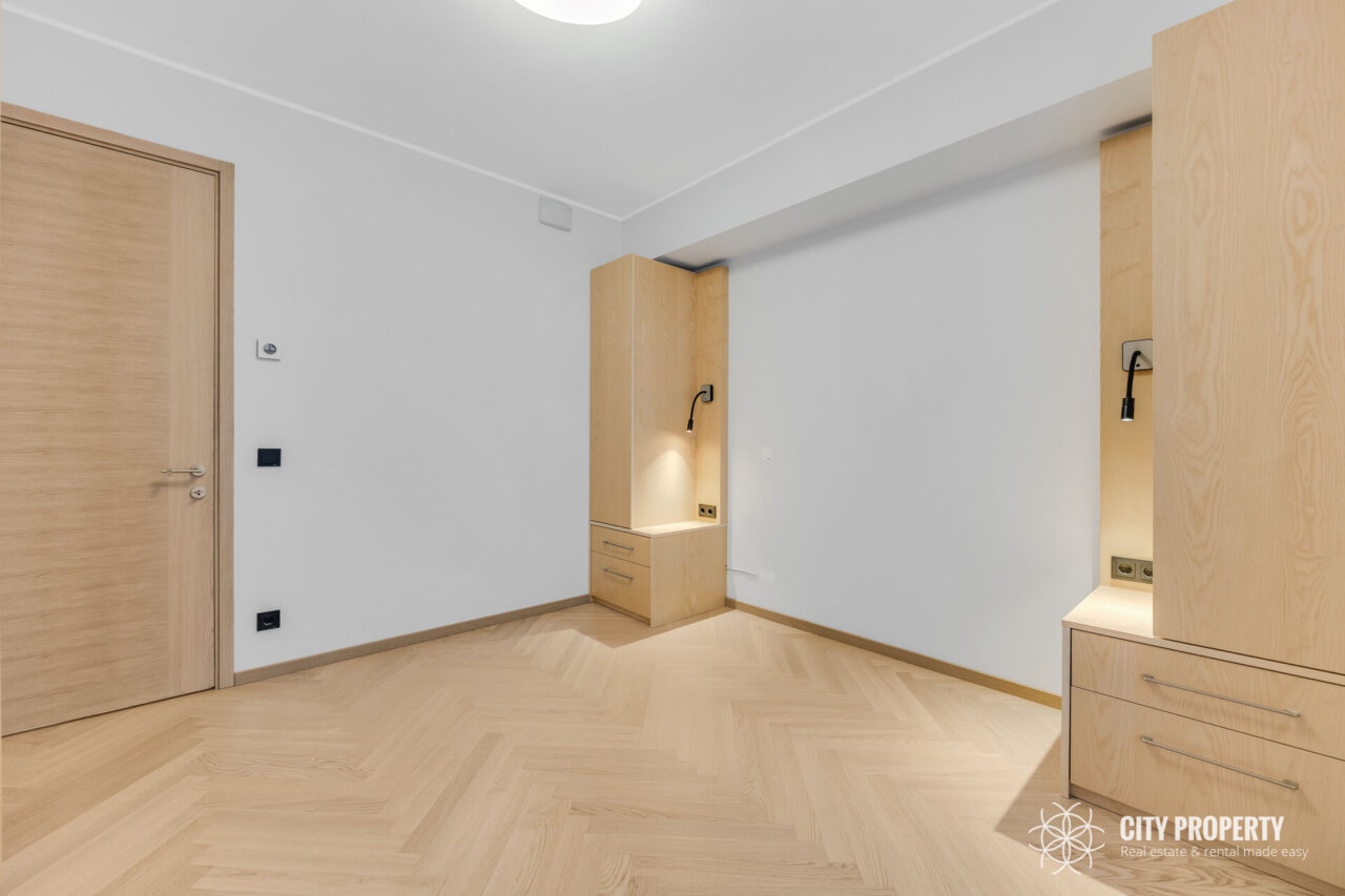 Köögis sisseehitatud köögimööbel koos integreeritud tehnikaga (külmik, õhupuhastaja, nõudepesumasin, ahi, induktsioonpliit, mikrolaineahi), söögilaud ja toolid (pildilt puudu). Elutoas diivan ja sektsioonkapp. Magamistoas sisseehitatud mööbel ja voodi (pildilt puudu). Vannitoas mööbel ning pesumasin ja kuivati.