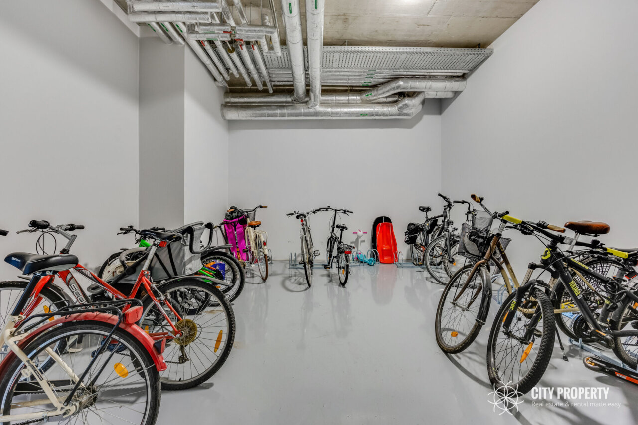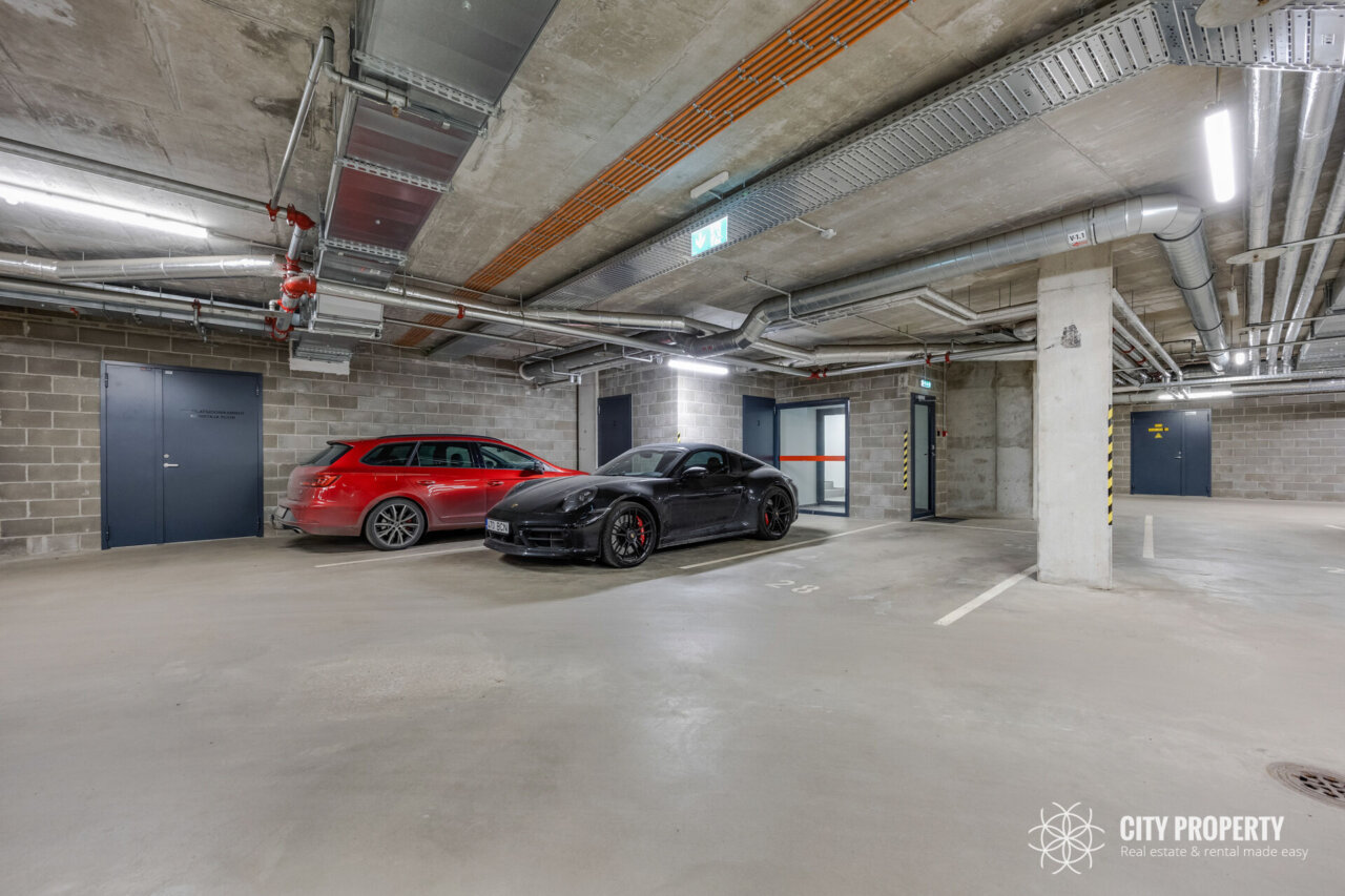Korteri juurde kuulub üks kindel parkimiskoht soojas maa-aluses garaažis ning lukustatud panipaik. Lisaks asub maja esimesel korrusel ka ühine rattaruum.