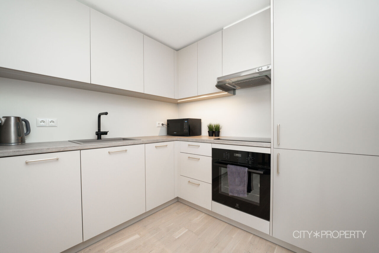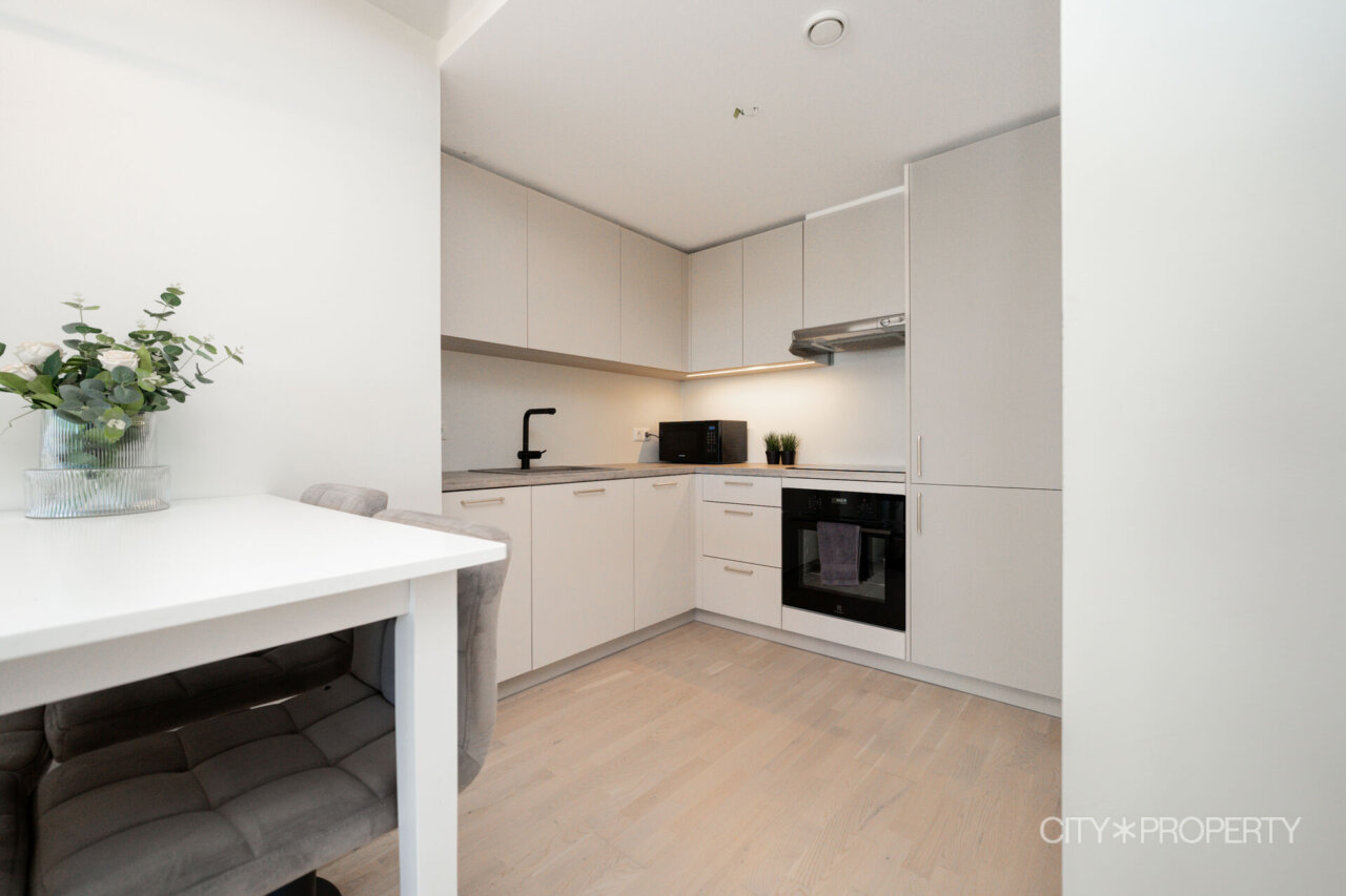 Kööki sisustab stiilne köögimööbel, koos vajaliku integreeritud tehnikaga (külmkapp, pliit, ahi, kubu, nõudepesumasin).