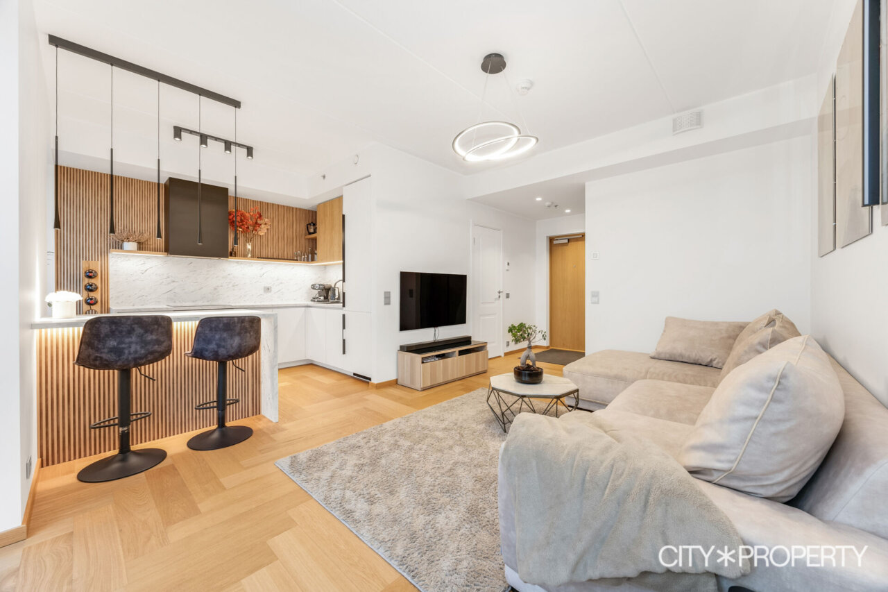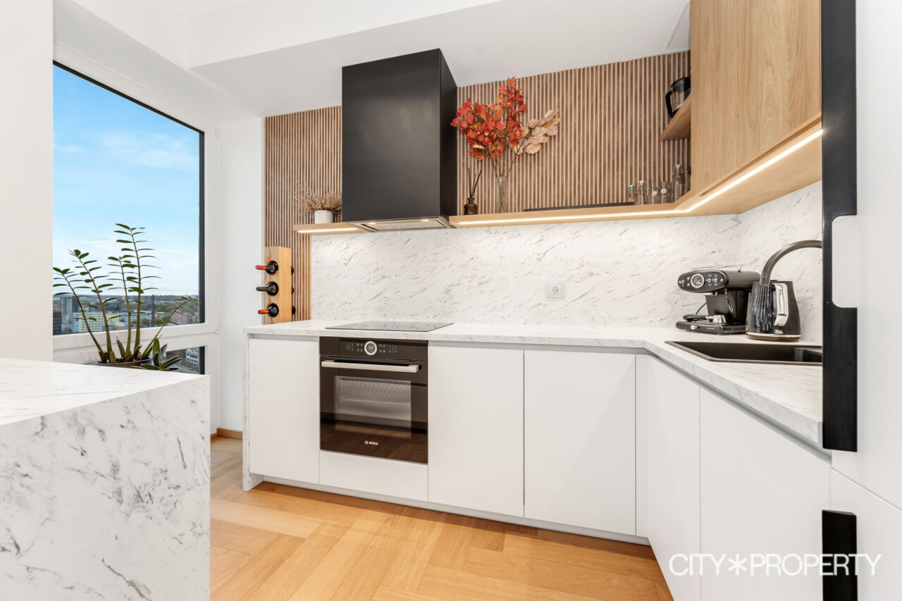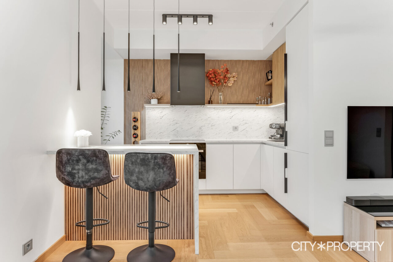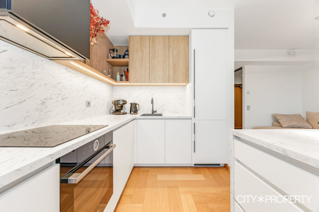 Köök on sisustatud kvaliteetse eritellimusel valmistatud köögimööbli ja integreeritud tehnikaga (elektripliit, elektriahi, õhupuhasti, nõudepesumasin, külmik). Elutuba ja kööki eraldab mahukate panipaikadega köögisaar.