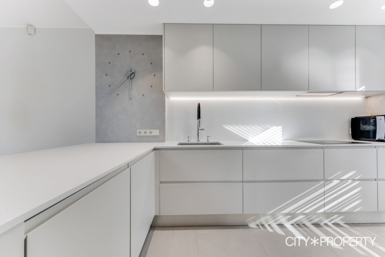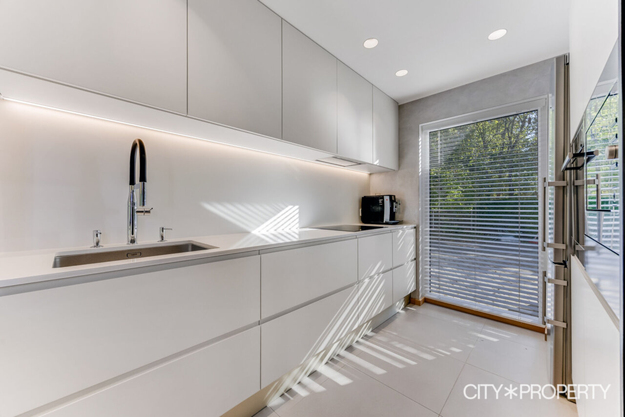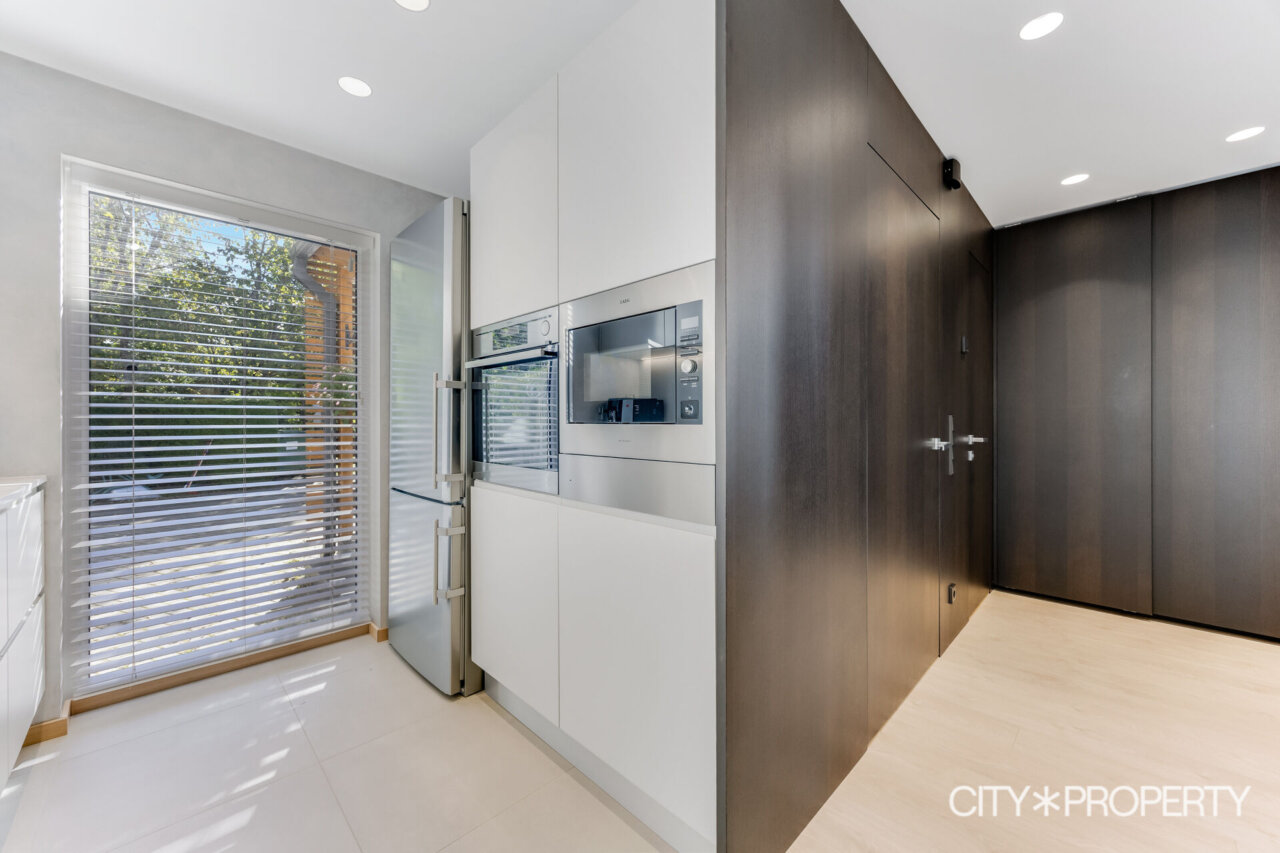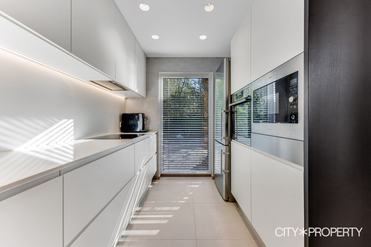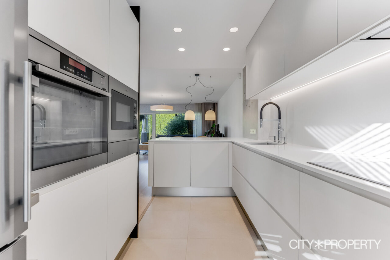 Esikust paremale jääb eraldatud kvaliteetse mööbli ja integreeritud köögitehnikaga (külmik, induktsioonpliit, praeahi, nõudepesumasin, kubu) aknaga kööginurk. Kogu köögilahendus on väga hästi läbi mõeldud ning kööki iseloomustab samuti praktilisus nii kompaktsuse kui sahtli-kapi süsteemide mõttes.